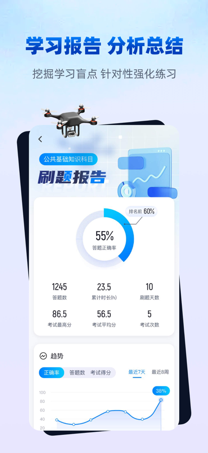 【无人机驾驶员考试聚题库——一键通关,轻松拿证!】 想合法飞行的你,是否还在为复杂的考试流程发愁?无论你是航拍爱好者、职业飞手还是行业应用专家,合法持证飞行都是迈向广阔天空的第一步。无人机驾驶员考试聚题库,专为CAAC执照考试量身打造,从报名到拿证,全程助你高效备考! 【考试流程全掌握】 报名审核:通过官方平台完成注册与资料提交 理论考试:100道单选题,60分钟,70分及格。涵盖航空法规、气象学、飞行原理等核心内容 实操考核:基本操纵、航线规划、应急处理等飞行技能测试 考试通过:获取电子执照,入驻官方无人机云系统 【驾照用途广泛】 -合法合规:商业飞行必备资质,告别"黑飞"风险 -职业准入:航拍、测绘、植保、巡检等行业敲门砖 -空域申请:持证可申请管制空域飞行许可 -保险理赔:多数商业保险要求操作者持证 -薪资提升:持证飞手薪资普遍高出30%-50% 【适宜人群】 -职业飞手:从事航拍、测绘、农业、电力等行业的专业人员 -转型人员:希望进入无人机行业的高薪求职者 -高校学生:航空、测绘、农林等相关专业学生 -业余爱好者:计划开展商业活动或操作中型以上无人机的玩家 【应用特色】 *海量题库:历年真题与模拟题,覆盖全部考点 *智能组卷:根据薄弱点生成个性化练习方案 *模拟考试:全真模拟考场环境,提前适应考试节奏 *详解解析:每道题配专业解析,助你真正学懂弄通 *法规更新:实时同步最新考试大纲和政策法规 【用户评价】 "刷题一周,理论考试92分通过!" "实操要点讲解非常实用,一次就拿证了" "比培训机构便宜多了,效果一点也不差" 未来天空,由持证者主宰!无论你是行业新人还是资深飞手,无人机驾驶员考试聚题库都是你考试通关的必备利器! 立即下载应用,开启你的职业飞行之路! 学习时间:每天30分钟,7天高效备考 投资未来:一次购买,终身使用,远低于培训费用 【温馨提示】考试政策可能调整,请以最新规定为准。建议搭配实操训练,全面提升飞行技能。