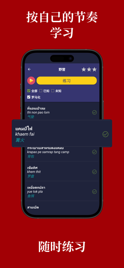 想以简单灵活的方式学习泰语吗? 拥有全球超过3000万次下载量的BNR Languages应用程序,帮助您以实用、简单和独立的方式学习泰语。 完整课程让您可以从零开始,学习字母表,建立词汇量,并通过母语音频录音练习阅读、写作和听力。 自主学习,按自己的节奏学习,没有每日限制,并使用复习模式加强您已经学到的一切。 非常适合希望快速学习泰语的任何人 — 无论是为了旅行、学习、工作,还是为了更好地与家人和朋友交流。 发现为什么我们的应用程序是随时随地学习的理想选择: - 离线泰语课程 — 从初学者到高级水平。 - 独立学习,按自己的节奏学习,无需老师。 - 没有时间限制或每日活动限制。 - 通过图片进行互动练习,使学习更加容易。 - 复习模式以练习和刷新内容。 - 带有可调节播放速度的母语音频录音。 - 不同类型的练习:阅读、写作和听力。 - 直观且适合各年龄段使用的界面。 - 参加每周排名并与其他用户竞争。 - 应用程序完全离线运行 — 无需互联网连接。 - 所有内容均免费提供。 立即下载,以简单、实用和灵活的方式开始学习泰语 — 按照您自己的节奏! Terms of use: https://www.apple.com/legal/internet-services/itunes/dev/stdeula/