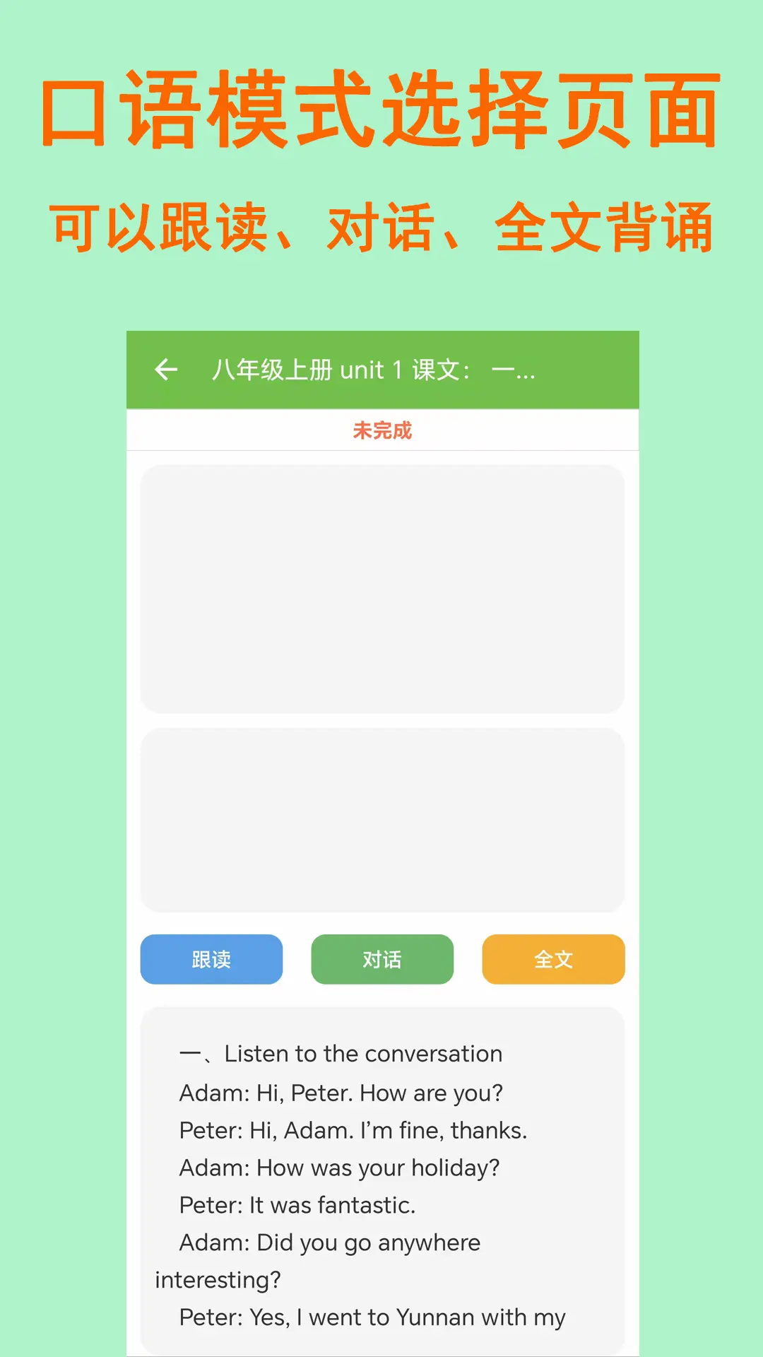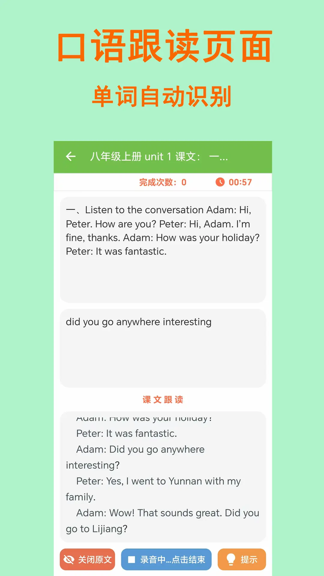 本次更新是我们软件的里程碑式更新,我们上架了英语智能教材系统。 英语教育从业者都在期盼一款真正的人工智能教育软件帮助教师解决教学的问题,家长和学生也都希望有一款真正能让学生很容易学会英语的软件来解决学生学英语的问题。 我们知道英语的学习需要大量的背诵,特别是口语背诵,一些优秀学校,老师都会让学生早读的时候将背会的课文给他们当面去背,很浪费老师和学生的时间,教学效率很低下。现在可以使用我们开发的英语智能教材来解决这些问题。智能教材从默写课文开始,看着课文的汉语翻译选词成句,这是背课文的初级阶段。中级阶段是听写课文,听着课文录音选词成句。口语课文主要练习学生的口语,使用人工智能技术判断学生单词读的对不对,口语课文可以和默写课文交叉使用,效率更高。口语课文的所有模式都可以关掉原文,这就是纯纯的背课文。在学校给老师背课文的环节以后都可以由采用人工智能技术的智能教材代替,让老师和学生都能提高效率,减轻劳动强度。 我们的智能教材最重要的子功能就是口语背课文功能,她包含有跟读、对话、和全文背诵。口语背课文功能的特点就是人工智能技术直接将口语识别成单词,读对的读错的单词一目了然,人工智能识别的精准度也非常高。直接识别成单词要比单独的口语评测好很多。口语评测,你不知道你所读的单词哪个错了,不精准,口语评测速度慢,使用体验非常不好。我们采用直接识别单词,这种方式体验好,速度快,效率高,学生和老师都喜欢。 智能教材不但背课文效率高,还可以在智能教材上直接做作业,可以背题。我们把教材上的作业题比如填空和问答都加上答案做成了课文样式,答案都包含其中,背会了包含答案的题,这个作业肯定就彻底搞懂了,也就彻底学会了这些知识。 老师后台管理部分也是智能教材的重要组成部分,学生背课文、写作业的情况老师都可以在后台查看,比如规定学生每篇课文要背几次,老师不需要面对面去监督学生,看后台学情就能了解所有情况。智能教材上还要开发老师上传作业功能,学校可以自主给学生布置教材外的作业。 智能教材必将是人工智能应用在教育领域的重要场景,也必将会让中国的教育科技领先于世界。 本APP各系统的开发均属原创。