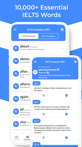 雅思词汇专业版是一款提升英语词汇量、助您在雅思考试中取得更高分数的终极应用。<br><br>这款应用包含 10,000 多个雅思必备词汇和数千个真实例句,旨在帮助您掌握雅思各个部分的词汇——阅读、写作、听力和口语。<br><br>✨ 主要功能:<br><br>📚 10,000 多个雅思词汇:包含完整含义和用法的词汇表。<br>🎯 20 个热门雅思主题:通过涵盖日常和学术主题的插图学习词汇。<br>📝 70,000 多个例句:结合真实语境,提升您的雅思阅读和口语水平。<br>🃏 抽认卡(卡片视图):更快、更轻松地复习和记忆词汇。<br>🌍 多语言支持:将含义和例句翻译成任何语言。<br>⏰ 每日生词:每天学习新词汇,持续提升。<br>🌙 夜间模式:无论白天还是夜晚,都能随时随地舒适学习。<br>📶 免费离线:无需网络连接即可使用所有功能。<br><br>无论您是准备雅思学术类考试还是雅思培训类考试,雅思词汇专家都是您的学习良伴。<br>👉 立即下载,开始用更聪明的方式积累雅思词汇,而不是更费劲!