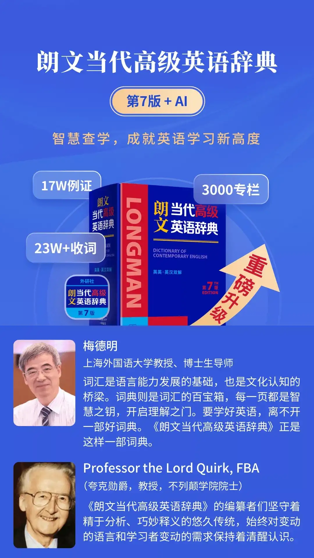 《朗文当代高级英语辞典》第7版+AI,融合英语大词典、搭配词典、交际宝典、语法大全、同义词词典、反义词词典等六大词典于一身,汇集了查词、背词、AI 翻译、智能语法分析等功能,配有精讲课程等多样化资源,以词汇学习为主线,兼顾阅读、写作、口语表达、备考、文化素养提升,形成“查—学—练—用”闭环。 本应用完整收录《朗文当代高级英语辞典》第7版权威内容,由海笛携手外研社官方正版发布。 *** 名人推荐 *** 【梅德明】 上海外国语大学教授、博士生导师 词汇是语言能力发展的基础,也是文化认知的桥梁。词典则是词汇的百宝箱,每一页都是智慧之钥,开启理解之门。要学好英语,离不开一部好词典。《朗文当代高级英语辞典》正是这样一部词典。 【夸克勋爵】不列颠学院院士 《朗文当代高级英语辞典》的编纂者们坚守着精于分析、巧妙释义的悠久传统,始终对变动的语言和学习者变动的需求保持着清醒认识。 *** 内容特色 *** 【规模升级】 收录单词、短语、释义23万余条,例证近17万条,增收1000 余条新词新义,各类学习专栏近 3000 个,体量居同类词典之冠。 【以“简”驭繁】 用2000基础词汇解释23万词义,浅显易懂,避免循环查证。 【词频标注】 多种词频标注满足不同学习需求,特别标注课标及欧框等级。 【一“辞”多用】 1部词典6倍功效:高级英语学习词典、词汇大全、语法大全、搭配词典、同义词词典、交际宝典。 【新概念英语词汇全突破】 朗文全新收录《新概念英语》1-4册单词:权威词典助学新概念、四六级等词汇更牢靠。 【精品课程】 内容丰富,每周一期,周周更新,以视频讲解的形式总结、提炼、发现、分享英语语言知识点。 【英文名著】 精选《小王子》、《金银岛》、《傲慢与偏见》等16本畅销名著,中英对照,部分配套真人精讲和题目练习。 【语法精讲】 《朗文A-Z英语语法大全》,按字母顺序对常见语法问题进行详细讲解,涵盖日常学习中遇到的语法难题。 【地道发音】 单词、例句提供英式、美式两种真人发音,助你学会地道口语。 【精美插图】 图文并茂,助你一张图记住一系列单词。 【英汉双解/英英/英汉切换】 根据学习喜好,可一键切换秒变英英词典、英汉词典。 【特色专栏】 490+中国特色词汇、 200个词根词缀专栏、100个话题专栏、800+语法专栏、500+词语搭配、500+语体专栏、600+个词语辨析专栏。 【每日一学】 可个性化定制每日新词、每日辨析、每日图解词汇等每日学习栏目。 *** 功能特色 *** 【AI智慧学习】 粘贴或输入英文句子、文段,即刻体验点击查词、智能语法分析、实时翻译等功能,轻松跨越学习障碍,让英语学习更高效! 【悦典】 融媒体化的纸书阅读体验,不仅可以像翻阅纸书一样翻阅词典,而且融入了发音、视频、图片等多媒体内容。 【一站式+AI多维度查询】 英汉双向互查,短语、习语、辨析、词块、例句一网打尽. 【背单词】 ※ 朗文权威内容,学习更牢靠。 ※ 个性化定制背诵计划,支持自定义做题模式,深度掌握单词。 ※ 各类需背诵的词书,一应俱全:新概念/四级/六级/考研/托福/雅思/专四/专八/考博/GRE/GMAT/SAT/旅游/职场/购物常用词汇等。 选择正版应用,学习更有保障!(版权所有,盗版必究)
