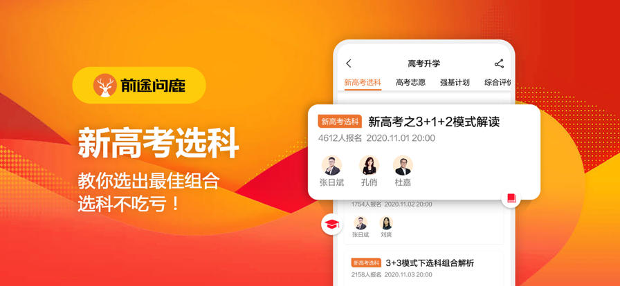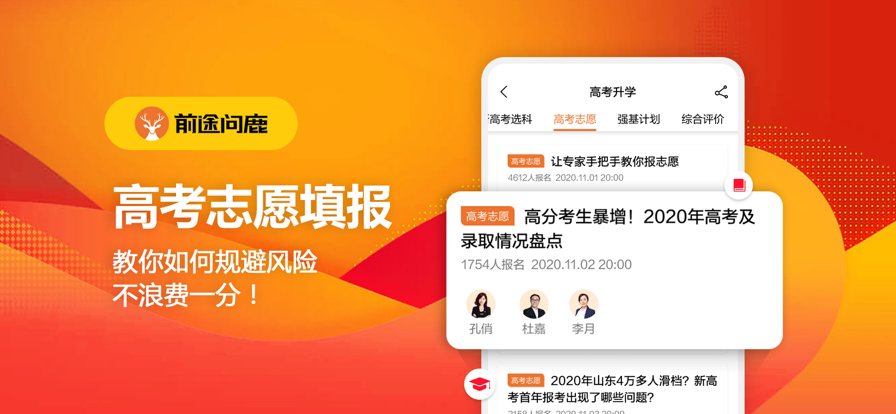 前途问鹿--高考必备升学利器,高考志愿填报参考系统 提前确定大学目标校,完美志愿从这里开始,助你成为乐学高考志愿君! 高一高二高三的高中生,面临高考报考的你,必须要装的一个 App: 1、高考升学:新高考选科、高考志愿填报、强基计划、综合评价招生、学习方法&提分技巧 前途问鹿覆盖新高考政策解读、新高考选科、高考志愿填报、强基计划、综合评价招生、学习方法、港澳台院校申请、升学通道解读、性格潜能测试、大学生涯规划、职业规划、求职实习等。致力于给高中生和家长提供新高考改革政策下的高一选科、强基计划、综合评价招生、高考志愿规划、大学规划的服务。 2、大学规划:大学生活、考研、留学、考证、求职实习 前途问鹿-高考志愿填报专家,超时长专项讲解,超耐心答疑解惑,实时互动解决高考升学疑难问题。高考志愿填报名师时刻在你身边,全方位360°贴心为你备战高考志愿填报! 3、职业规划:求职实训、实习机会 前途问鹿拥有业内顶级升学规划专家团队,由多位毕业于清华北大等一流名校,来自新东方学而思跟谁学腾讯网易有道朴新教育,投身生涯规划行业十余年的专家名师组成。 升学规划,让天下没有难报的高考志愿,从数千大学数百专业中挑选最适合自己的那一款高考志愿方案! 前途问鹿-贴心为你的手机高考志愿填报专家+高考直通车+夸克高考。 面朝梦想,奔跑吧,高考少年~ 【联系我们】 前途问鹿:www.qiantuwenlu.com 高考志愿帮:www.gkzyb.com 前途问鹿微信公众号:微信搜索“前途问鹿”、“选科与高报” 、“强基计划和综合评价” 前途问鹿微博:前途问鹿