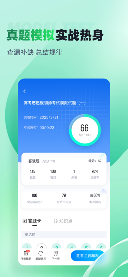 高考直通车:全方位高考服务平台,助你圆梦高考! 我们提供AI智能+大数据志愿填报助手、测录取概率、志愿捡漏、风险评估、高考咨询等志愿服务,提供实时更新大学录取分数、专业录取分数、计划招生人数、院校库、专业库、职业库及专业测评等工具辅助考生和家长报志愿。 【高考报考服务】 1. 模拟填报助手: 基于大数据和人工智能,实现院校和招生专业的录取概率预测!还有专业测评、同分去向等实用小工具,帮你做好高考志愿规划,辅助完成高考志愿填报,超智能便捷! 2. 测录取概率: 通过人工智能技术,智能计算最佳志愿方案,提供科学合理的填报建议,同时根据近5年录取数据综合智能推荐算法,为考生推荐录取概率高的大学。 3. 个性化推荐: 可以根据考生的关注点进行个性化推荐大学,包括专业/就业方向等。通过多维专业测评,为考生推荐出与性格及兴趣相匹配的专业方向。 4. 一键智能填报: 全面适配全国30个省份高考报考规则,一键快速匹配适合的志愿方案。让考生和家长轻松上手,快速完成模拟志愿填报流程,轻松找到适合你的大学和专业。 5. 志愿风险评估: 检测志愿表的风险分析,及时反馈填报结果,帮助考生更好地了解志愿填报情况,并可把志愿表Excel导出到本地编辑调整。 6. 院校库/专业库/职业库: 覆盖全国所有高校,985/211/双一流高校一网打尽,查分数、查专业、查院校一站式服务。汇集了教育部2500+专业、5年+分数线。整合各种职业信息、就业岗位、招聘信息,并与专业库进行联动,让专业选择更有前瞻性。提供热门专业推荐和职业前景分析,让考生选择专业不再迷茫。 7. 志愿捡漏系统:经过大数据算法推荐专业或院校,让你实现捡漏专业,捡漏学校等功能,可以实现低分高录。 8. 高招咨询会: 高校招生系列直播,大学教师和生涯规划师在线指导,详尽解读招生政策、王牌专业,给予考生和家长专业的升学指导和报考建议。 9. 模考成绩预测报告: 提供多种评估方式,包括模考/高考的学科成绩、综合素质、志愿意向等,为考生和家长提供高考预测报告服务。 【高考备考服务】 1. 车车AI:你的智能高考助手,全程陪你高考的智能小伙伴。 2. 高考真题&各地模考: 高考全国卷、各地一二模统考、北京卷、江苏卷、上海卷、浙江卷、天津卷、百校联考、A10联盟等海量高考模考答案快速更新,在线对答案。 3. 试题库: 试卷云管家功能,错题本、超智能识别试卷、清除手写笔记等,高度还原试卷原本样貌!试卷永久存储,快速查找整理归类整理错题本。 4. 目标计划: 设定高考目标,制定模考计划,规划每日学习计划。借鉴学霸的复习策略,与优秀同伴一同前行,共同迈向理想的大学。 5. 成绩管理: 记录每一次模考、月考、周测、统考成绩,制定考试目标,清晰展示每一次的考试差距。系统智能成绩分析,帮你快速找到学习症结所在,查漏补缺。 6. 自习室: 专属于高中生的在线自习平台。严苛模式和学霸模式,帮你解决自律能力弱,学习不主动问题,摆脱过度依赖手机,做你的贴身学习监督管家。 7. 高考倒计时: 每日早起签到,陪伴高三每个倒计时,还有正能量、每日一图等等,千万学霸一起追逐心中理想大学!还支持自定义多个倒计时,锁屏等等。 8. 高考头条: 高考动态、报考指南、自主招生、综合评价、专项计划、复习经验、学考录取,这里有超全超快的高考头条资讯,助你快速捕捉高考动向,抢占高考制高点。 9. 同学圈: 在线交流火热话题,分享复习经验,与老师、同学交流学习规划、探讨学习难题、共享学习方法,互相监督,共同进步。 10. 学霸笔记&学习干货: 内容涵盖了各个知识点,对重点、难点、疑点都进行了详细解释,有助于全面掌握知识。快速获取学霸复习经验和解题技巧。