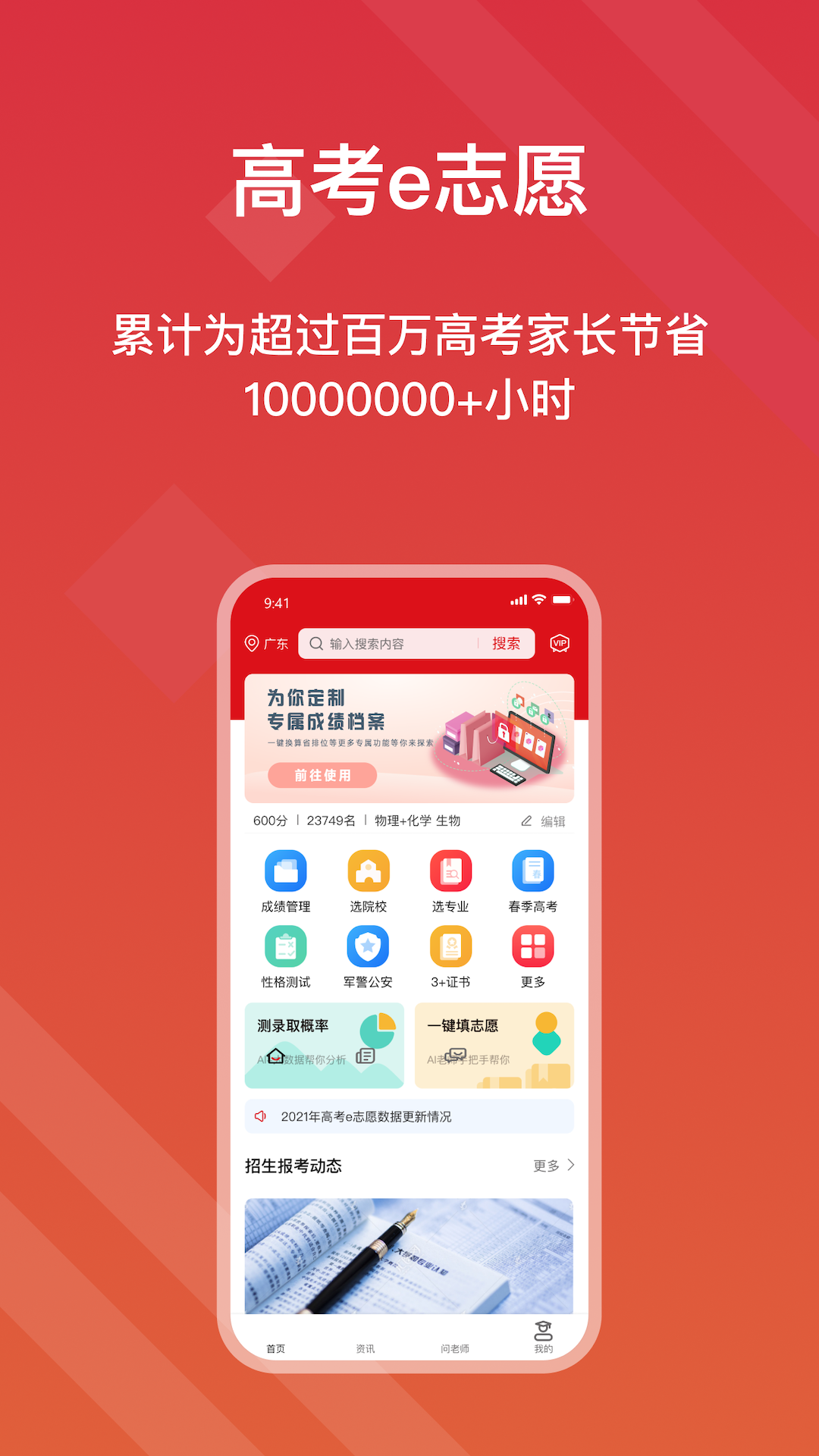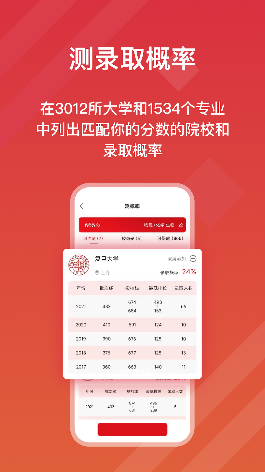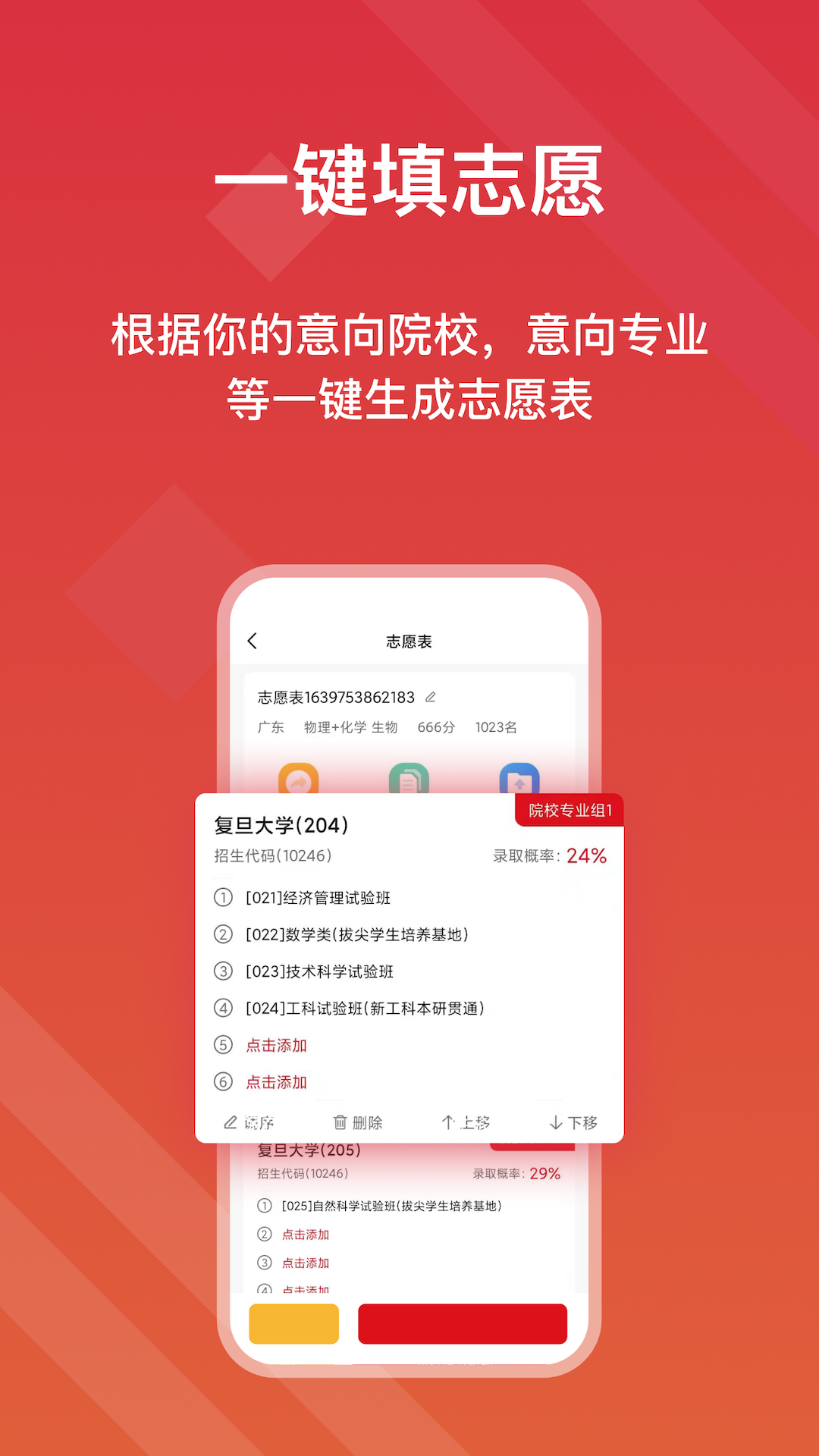 高考志愿2024专注于高考志愿填报的大数据,为考生提供在线的高考志愿填报、新高考选科、学业测评等升学规划服务。AI智能+大数据功能帮助全 国千万考生完成高考志愿填报推 荐。高考招录数据实时更新、志愿模拟填报更是根据当年招生计划进行推 荐。<br><br>高考报名咨询、高招动态、招生章程一站式获取<br><br>招生计划分数线查询、志愿填报、模拟填志愿 学长学姐们都在用的高考志愿填报功能<br>与考试院数据同步的志愿填报平 台,多所院校近年院校、专业录取数据、招生计划与省考试院同步更新。根据院校历年录取分数线、位次和当年招生计划等数据,结合目标专业、高考成绩,运用6大核心算法推荐录取率高的院校。<br><br>一键填报,快速匹配适合的高考志愿方案<br>全面适配全 国多个省份高考报考规则,一键快速匹配适合的志愿方案。<br>院校优先填报:依据院校历年的录取分数,结合智能推荐算法,推 荐录取率高的院校。<br>专业优先填报:结合目标专业、成绩、筛选出匹配、精 确、合适的院校。<br>测录取概率:结合高考成绩和院校历年录取,智能计算出目标学校的录取概率