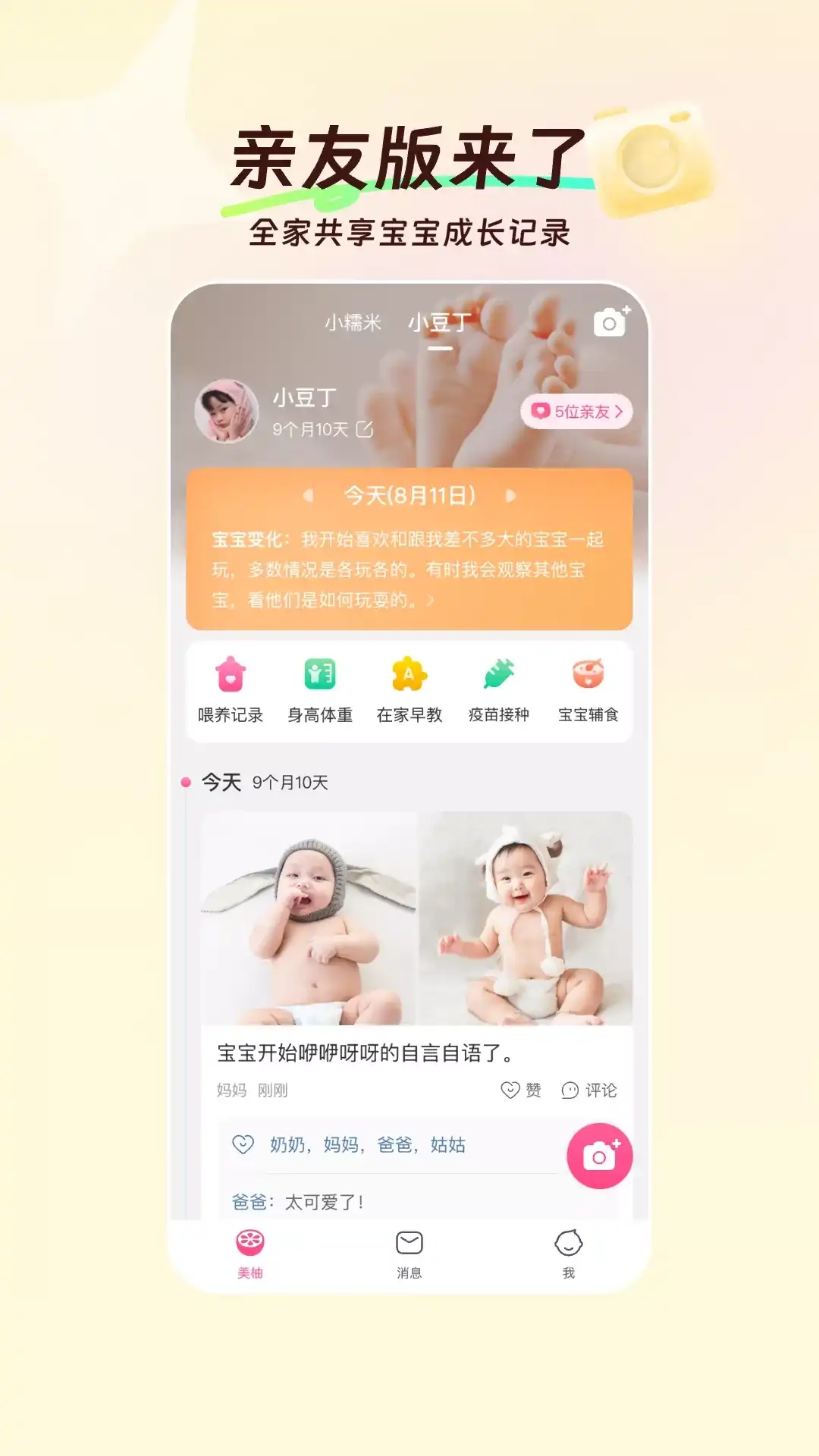 亲宝宝——记录成长,科学育儿 成长记录云空间,全程记录宝宝成长。一人上传全家共享,内容长久保存不丢失;科学实用的智能育儿助手,针对孕期和不同阶段的宝宝,进行个性化孕育指导;亲宝宝品牌商品,专注宝宝成长所需,千万家庭放心之选。 【成长记录云空间】 宝宝的照片、视频均可智能上传,邀请家人加入,安全私密、互动分享。“成长MV”功能,让宝宝的成长记录更加有趣。 【智能育儿助手】 专业的孕期指导:每周须知、产检提醒、能不能吃等,助你顺利度过整个孕期。还可以在社区和孕妈们一起交流分享。 个性化的专属育儿指导:在家早教视频指导、辅食食谱、故事儿歌、成长评估等都在这里。 【亲宝宝商城】 亲宝宝产品,宝宝放心用。 以“科学”、“品质”、“安全”为品牌理念,为孕妈及0-6岁婴幼儿提供纸尿裤、纸品、喂养用品、童装、玩具、零食辅食等多品类产品。育儿专家团的专业把关和头部供应链的品质保证,让每一位宝宝和家长都能享受到高品质、高性价比的产品体验。 在使用过程中遇到任何问题,欢迎反馈给我们: -在线反馈:打开亲宝宝,点击“我的”-“意见反馈” -微博:@亲宝宝APP官方 -官网:www.qinbaobao.com