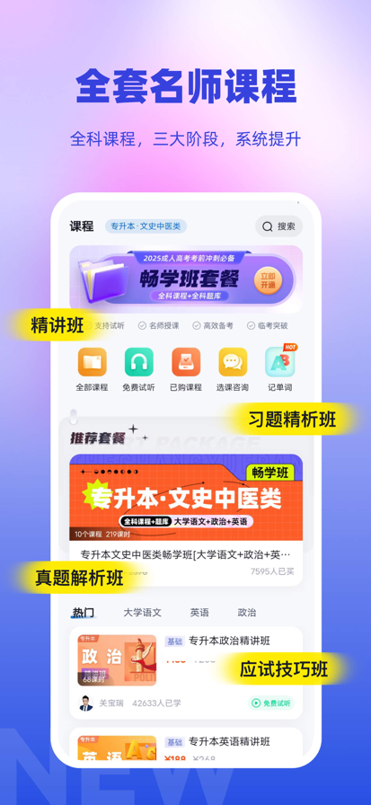 成人高考高升本专升本最新题库全新上线!题库、课程、资讯应有尽有~ 【成考海量题库】 海量成考题库,数十万道试题及解析,历年真题、考点练习、考试资讯,紧扣最新成人高考国家权威考试大纲,高效练习。 【精品课程】 热门成考课程,历年真题讲解,成考讲师带你全方位学习成考。课程支持离线下载,随时随地学习。 【大数据学习】 练习报告,智能评估,实时掌握学习情况,近万个知识点,逐个突破。
