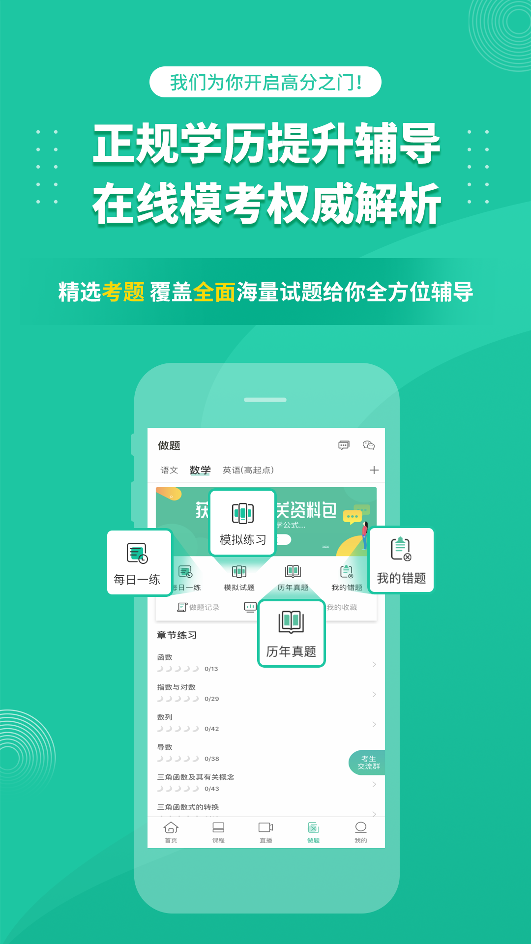 成人高考,考生福利来啦~~ <br>你想快速通过成人高考入学考试吗? <br>2022年高达专、高达本、专升本历届考试真题全新上线。 <br>高起专成人高考、高起本成人高考、专升本覆盖全国20多个省市,千所合作继续教育考试院专业,铸就学历提升。 <br>【免费直播公开课】 <br>形成科学的方式,教、学,练,问,一套完整解决方案。让你掌握高效学习方法助力考试。 <br>必考知识点,考试须知,历年真题讲解,想过成人高考———坚持每天上直播。 <br>【成考新版免费视频】 <br>同步成人高考国家权威考试大纲,按章节系统学习,360度无死角学些,国家正规考试教材。 <br>高清视频,支持离线下载,清晰度选择,给学员提供免费体验的视频观看,别人每天赶着去上课。 <br>在家里、在公司、在公交、在地铁...,为学员提供随时随地做题。 <br>【成人高考考试题库历年真题】 <br>章节练习,配合免费视频,一起学习,看完视频,刷刷题。 <br>真题模考,全面检测自己的不足之处,有针对性的再次练习。 <br>学习报告,统计每天正确率,学习时长估算你的考试分数高准率。