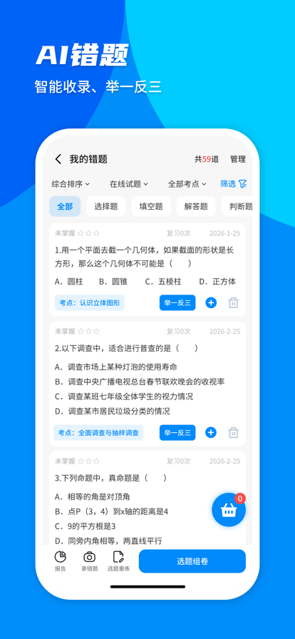 菁优网,专注服务教师、学生、家长,一站式满足小学、初中、高中全学段组卷、备课、刷题、练习、考试全场景试题试卷需求。覆盖语文、数学、英语、政治、历史、地理、物理、化学、生物全学科,适配人教版、北师大版等多教材版本,名校名师联合供题,题库超 3000 万道、试卷超 200 万套,日均更新超万题,紧贴中高考命题趋势。 【AI 组卷备课】 支持AI 组卷、拍照组卷、知识点挑题、章节挑题、试卷挑题、智能组卷、细目表组卷等多种模式。可快速生成优质试卷,支持 Word/PDF下载打印,公式排版无损,公式可再编辑,提升备课效率。 【AI 教学工具】 拍照组卷、AI试卷擦除、AI 智能备课,AI试卷分析,AI试题改编,教案课件一键生成、公式编辑器(支持菁优公式、微软公式、 MathType格式)等 【AI学情诊断】 家长必备智能学习助手!支持拍照解题,错题训练,一键查看孩子学情报告、作业数据、错题统计,学习进度实时掌控,帮助家长辅导孩子作业、监测学情。 【中高考真题·名校试卷·答案解析】 收录千所名校、各地中高考真题、小升初、模拟、会考、期末、期中、月考、竞赛卷等资源,海量试题均配有详尽的分析、解答、点评、考点专题等,部分还有视频讲解,数理化尤其领先。 【学情报告·错题闭环】 为学生提供学情分析报告,针对薄弱点进行强化练习,搭配AI训练、AI错题、同类题再练、举一反三等,实现 “ 拍搜 - 练习- 收录 - 分析 -错题训练” 全闭环。 【名师专题·专项突破】 联合一线名师打造专辑,覆盖学科考点梳理、重难点强化、易错题型突破。从基础巩固到培优提升,适配不同学情,刷题更有针对性,轻松攻克薄弱学科。 【手机电脑·多端互通】 电脑、手机APP、平板、微信小程序,数据全同步。区分教师端、学生端、家长端,使用更便捷。教师备课、组卷,随时切换;学生测评训练、错题整理不受限。支持资源收藏、试卷存档,专属个人题库,省时省力。 【校本题库·校内共享】 助力学校机构打造个性化题库,支持校本选题组卷、资源分类归档,教师可快速从校本题库选题组卷,搭配菁优网海量题库灵活组合使用,出卷贴合本校教学进度与学情特点。 1. @数学学科Wang: 作为一线教师,菁优网真的是备课神器!知识点选题、拍照组卷很好用,试卷可以直接下载打印,再配合AI 批改和学情诊断全面解析详细,大大减轻了备课和批改压力,课堂教学更高效了! 2. @学霸作文100分 菁优网各科考试刷题资源丰富,试题解析详尽,中高考分析准确。菁优网不仅可以错题拍搜,还有很多好课、网课可以看,孩子学习进步明显,真是一个非常棒的刷题神器和作业帮手。 3.@数理化真题工作室: 我们机构倡导AI伴学,在用菁优网题库+AI工具,大大提升教学效率。尤其是菁优网,真题与专项练习丰富,学员薄弱点清晰可见,举一反三强化训练效果显著,对学生的续课与机构的提分口碑双提升!