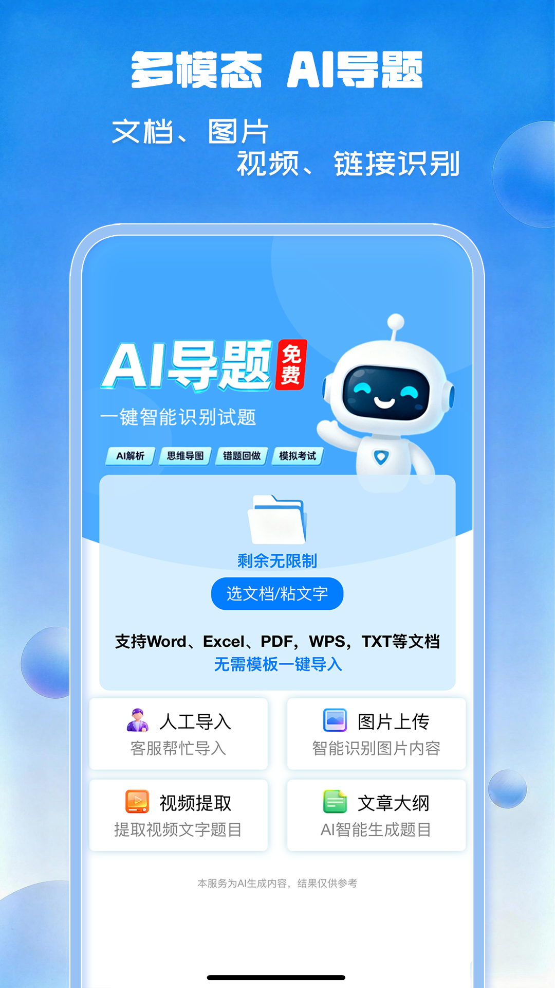 职业资格考试题库大全,手机智能导入题库,支持十余种常见题库文档格式,无需整理文档一键导入题库、扫一扫搜题快速高效、超强错题本功能齐全、模拟考试,试题练习,错题回做,随机出题,语音听题、扫一扫搜题、拍照搜题、悬浮窗搜题、整页搜题、关键字检索答案、各种新职业考试题库,轻松通过考试。 智能导入、导入试题、导入文档、导入题库、上传、上传题库、上传试题、制作、制作题库、制作试题、自制题库、整理题库、整理文档、考试题库、职业技能鉴定题库、 包含题库:茶艺师、辅警、列车长、信贷、普速、通信、护理、应知应会、电网、毛概、 消防、铁路线路工、星级、电力、变电、每日时政、货币、会计、动车、配电、检车员、维修电工、车辆钳工、物流、煤矿、供电、无人机、育婴师、铁路、驾驶员