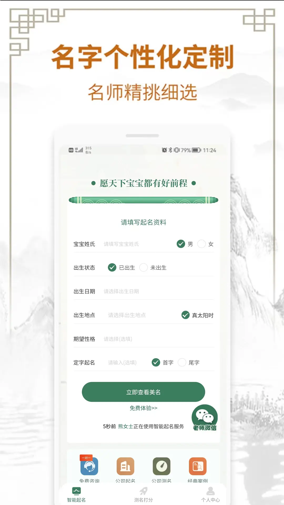 我们提供传统宝宝与公司起名、起名字、取名、取名字、改名、改名字、测名、测名字一站式服务的专业起名取名、软件大全,解决你给宝宝在出生证明、户口起名的难题,解决公司起名取名,公司核名难问题。 【数据专业性】 引入四书五经,国学经典;起名意蕴深长,超凡脱俗 生肖起名 诗经起名 楚辞起名 诗词起名 【取名智能性】 千字库+百万算法组合,姓氏起源与名字传承精准匹配 【产品体验性】 上万个免费名字推荐,更有专属高级定制款 【测名全面性】 结合出生时间,多维度深入解说名字释义 【资讯科普性】 为您提供常用名介绍,深度解读,取名等入门指南.