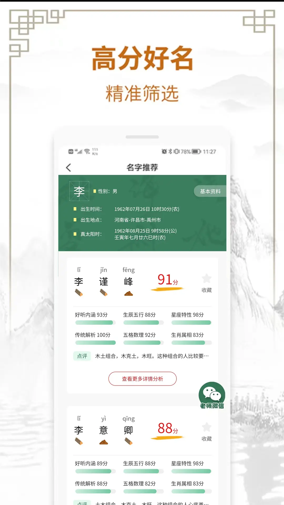 周易测名字打分神器汇集整理数百部国学经典名著,诗经子集,四书五经;通过大数据分析加专业人工筛选,结合文化寓意、发音韵律、字形结构等多方面因素,将汉语言文学抽丝剥茧从上百部国学经典中精炼适合现代宝宝的好名字供爸爸妈妈们参考,每个名字都有其相应文化出处和含义,为您量身打造具有意韵深远,顺口好听的好名字。 【全方面测名打分】 基于AI大数据分析姓名测试打分,通过名字测试系统,流行度分析起名系统,分析名字的使用频率与流行度趋势,多维度名字分析维度,姓名打分让名字数据可视化,结合传统解析和五格数理等为用户提供更专业,更科学,更权威的测名分析结果,让您读懂名字背后的寓意。 【国学起名取名】 周易测名字打分结合传统国学起名方式,综合音律、字形结构、音形意蕴等多方面,通过特有的智能AI算法,结合传统生辰五行、易学数理、生肖星座等维度,沿用古法传统文化,为宝宝起名字!免费高分名字、吉祥名字、富贵名字、好听名字,任你挑选,为宝宝起一个有内涵有格调的好名字,帮您解除起名字的烦恼。 【专业大师团队】 资深起名专家团队为您提供多对一、一对一起名,专业易学教授国学老师提供高质量手工起名,定制起名测名服务,通过对生辰分析,姓名心理学,生肖解析,音形义等复杂分析,反复筛选,综合平衡,结合易学数理,三才五格,国学诗词为您提供吉祥有寓意,顺口又好听的名字方案,专业起名服务,满意为止,打造独特的专属好名。 【公司店铺产品起名 品牌策划】 AI智能公司起名,基于名字大数据AI智能分析起名,AI智能公司起名字算法深度学习全国8千万公司名数据,通过智能分析名字频率,结合行业特色,城市地区、法人生辰日期,易学卦象,将传统起名与现代科学起名相结合取一个响亮吉祥的好公司品牌名。 【百家姓氏溯源】 百家姓氏文化起源查询,看看自己姓氏来源,历史名人,经典典故等让您了解姓氏文化,为宝宝取名提供专业的起名信息帮助。 【其他功能特色】 1、结合您的生日资料,依照传统文化,为宝宝起名字,高分名字、好听名字,任你挑选,为您起一个有内涵/有格调的好名字; 2、通过特有的智能解名算法,结合音律音调,字形结构,音形意蕴,为您的姓名提供多维度分析,了解姓名拥有的能量助力。 3、起名详细功能:诗经取名,字典起名,男宝宝起名,女宝宝起名,男孩起名,女孩起名,高分起名,吉祥起名,富贵起名,测名,解名 4、为您收集包含起名技巧,好名标准,让您对名字的标准更加了解,了解姓氏文化。 5、更有取名知识,英文名,小名,诗词起名,四字名,新华字典,流行趋势等起名大全工具助你免费取名。
