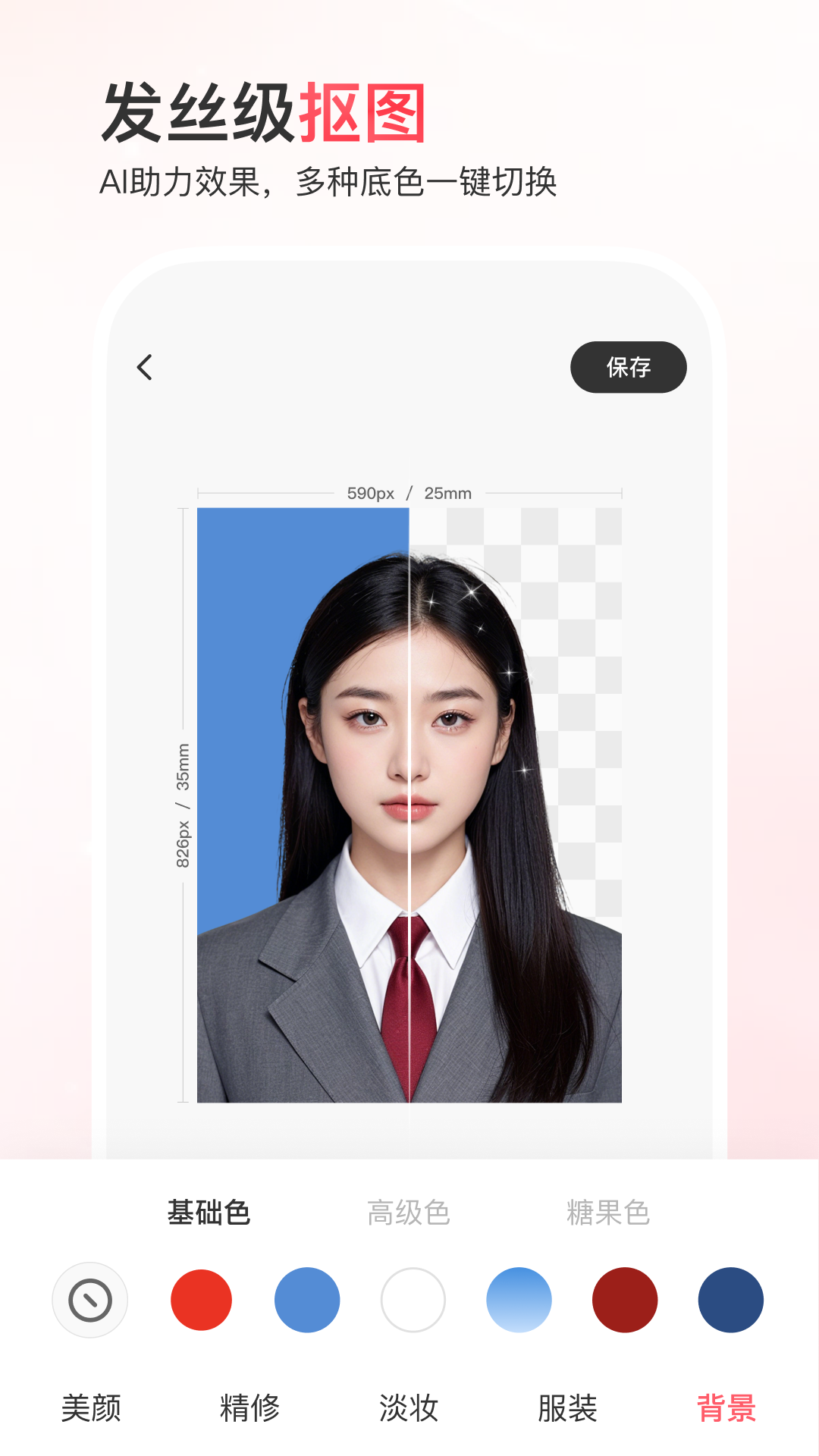 一寸证件照相机,一键换底色,智能抠图换正装。帮助你足不出户,就能拥有自己的证件照!内含多种尺寸,满足所有的证件照需求。 <br> <br>【多种规格】 <br>一寸、二寸等常用寸照;专升本、成人自考等学历考试;英语四六级、普通话水平测试等语言考试;计算机等级考试;教师资格证、驾驶证、导游证等职业资格;泰国签证、日本签证等多个国家旅游签证;公务员、事业单位考试;社保证、身份证等身份证件;结婚登记照、职业形象半身照! <br> <br>【智能换底】 <br>根据您需要的规格,正确拍摄人物位置及比例,多种底色可选择~ <br> <br>【一键抠图】 <br>智能算法帮你抠出人像,连头发丝都可以抠出来哦! <br> <br>【自然美颜】 <br>专业的人像识别技术,可以将照片人像进行磨皮、美白! <br> <br>【精美正装】 <br>男女、正装、童装等多套个性服装任意挑选! <br> <br>【多底色保存】 <br>勾选多底色保存,直接保存所有底色的证件照,操作简单,节约时间!