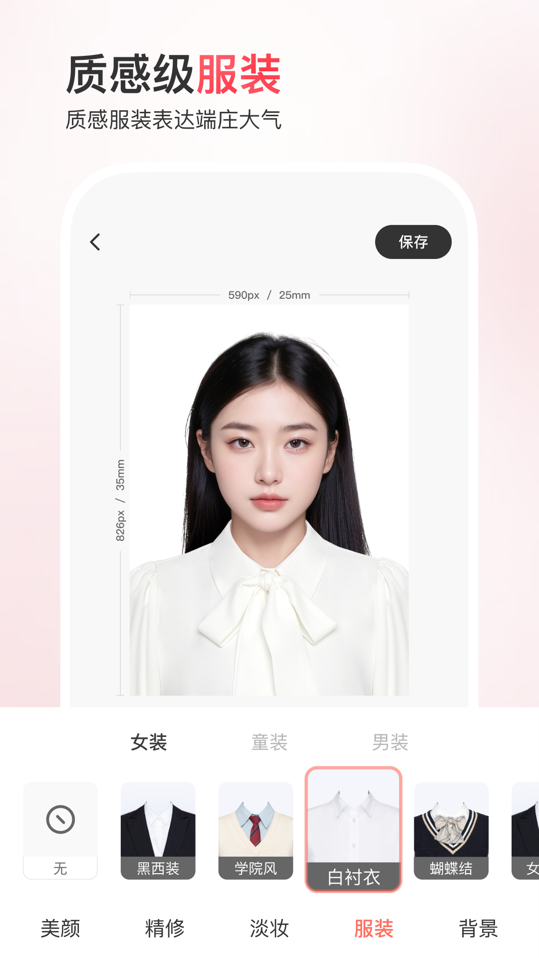 这是一款专业、简单、方便的证件照制作软件!上百种系统专业尺寸库、快速背景替换、一键智能美颜,轻松为你拍出专业、合格的证件照。<br><br>【尺寸齐全,满足各种场景需求】<br>不仅包含一寸、两寸、三寸、四寸、小一寸、小二寸等常规证件照尺寸,还人性化地为用户提供场景选择。如:身份证、驾驶证、社保证、签证等证件;计算机、教资、会计、考研、公务员、英语四六级、普通话等百余种考试等。<br><br>【一键换底,多种底色免费更换】<br>智能图像处理算法,抠图精细到每根发丝,避免边缘模糊等问题。系统一键更换多种底色,操作简单省事。同时,除了红底、白底、蓝底等常规色以外,更有高级色、马卡龙、渐变等个性化底色可供选择,满足您多元风格需求。<br><br>【智能换装,海量服装任选】<br>不仅提供职业西装、衬衫等正装,还有韩系、日系等学院风热门服装可更换。男装、女装、童装素材齐全。换装毫无违和感,证件照也能美美C位出道!<br><br>【智能美颜,打造妈生自然裸妆】<br>一键匹配干净自然妆容,智能美颜。可选择伪素颜妆、元气妆、女神妆、男神妆等多种妆容风格,提升照片质感,还原美貌不是梦!从此自信应对各种证件照场合。<br><br>【不含水印,电子档快捷保存】<br>根据拍摄或相册照片,快速生成证件照电子版,可免费高清无水印保存。这波羊毛我先薅为敬!