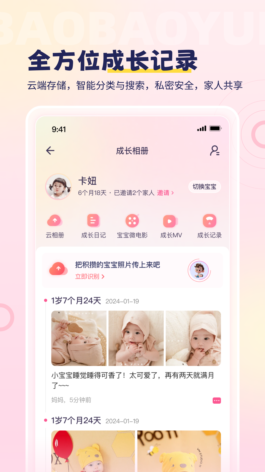 宝宝云APP——孕育旅程的智能伴侣 宝宝云APP为您提供从备孕到育儿一站式母婴服务,作为6000W+用户的选择,我们致力于让每一位让每一位宝妈的孕育之路更加科学、便捷。宝宝云APP包含宝宝微电影、孕育知识库、成长相册、专属健康顾问等栏目,提供孕前、孕中、育儿知识宣教,孕检、疫苗、体检提醒等服务,以专业知识、母婴服务集交流为核心,提供专业的个性化服务,为新生儿家庭提供体系且科学的育儿解决方案,帮助孕育过程更省心、更省事。 【珍贵成长记录】 宝宝微电影:记录宝宝成长的每一个珍贵瞬间,记录永恒。 成长相册:支持照片、视频、日记等多种记录方式,提供成长MV、趣味孕照等多种精美成长记录模板,轻松制作宝宝成长相册。 【全面孕育支持】 专属孕育知识库:提供孕前、中、后期全面的孕育知识宣教,随时随地在线学习,为孕育的每一步保驾护航 智能健康提醒:宝妈孕检、宝宝疫苗、宝宝体检提醒,确保宝妈和宝宝健康无忧 专属健康顾问:24小时在线咨询 【社交与分享】 同城群聊:与志同道合的同城宝妈,分享交流孕育经验 母婴圈子:加入不同主题的圈子,分享孕育理念,交流生活点滴 在使用过程中如遇到任何问题,欢迎您及时反馈给我们: 在线反馈:打开宝宝云,点击“我的”-“设置”-“投诉反馈” 客服热线:0851-86907418
