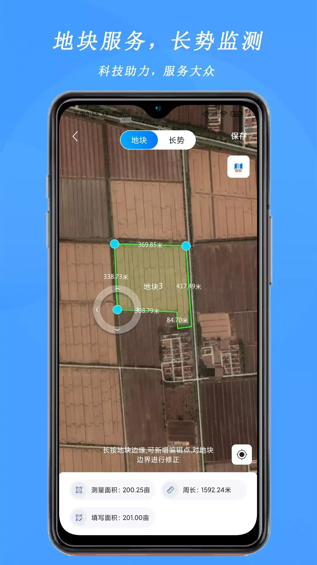 测亩宝是一款集测亩仪、地块管理、作物管理等功能于一身的专业农事服务App;广泛应用于农业生产过程中,在 耕、种、管、收 等环节提供地块面积测量、地块管理、作物长势分析、账本记录等服务,是一款免费的应用软件;内置多种图源,满足不同人群的测量需求;提供多种测量方式:环绕土地测量、高清地图上勾画测量、车载测量、边走边画测量等,软件支持离线测量,适用于多种场景,支持自定义画地块,智能计算周长、面积,测量结果云端存储,数据永不丢失,便于查看及分享;测亩宝把测量搬到手机上,零门槛、高精度,高效率,专业测量长度、面积、海拔高度等,让测量变得更加便捷。