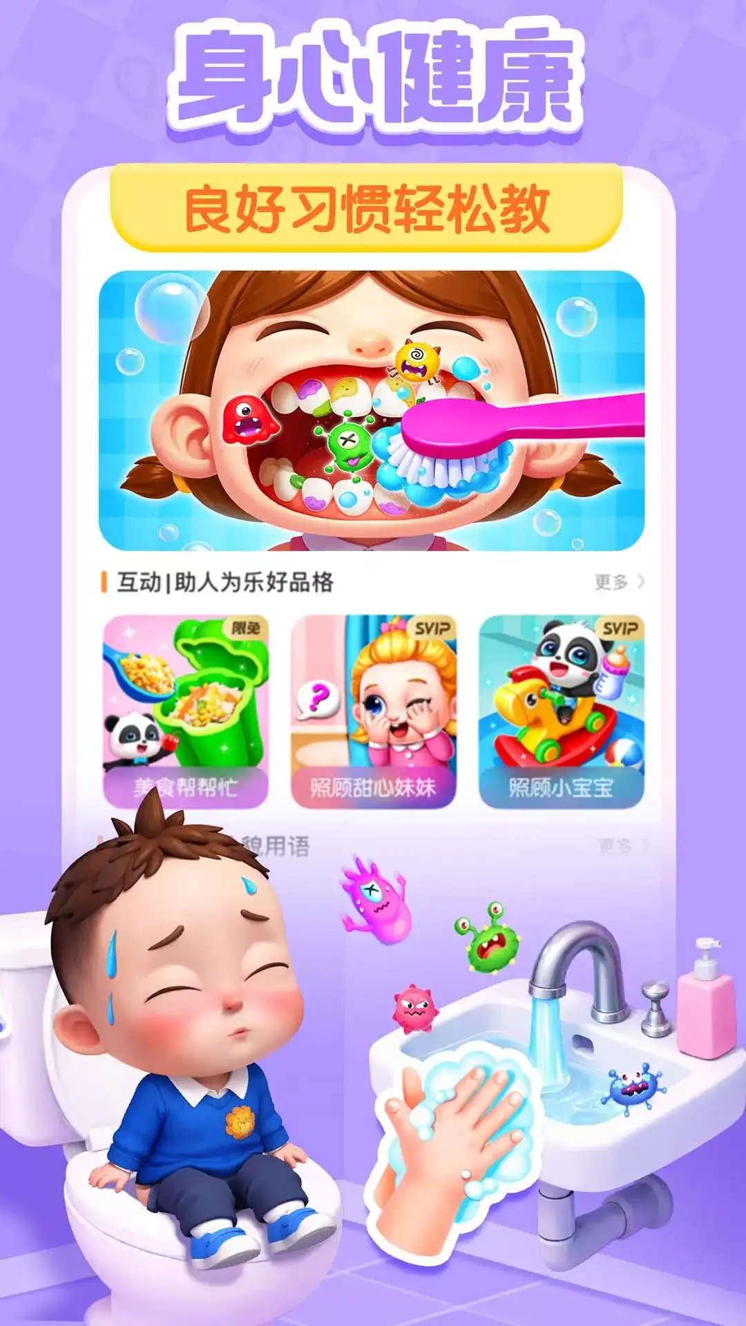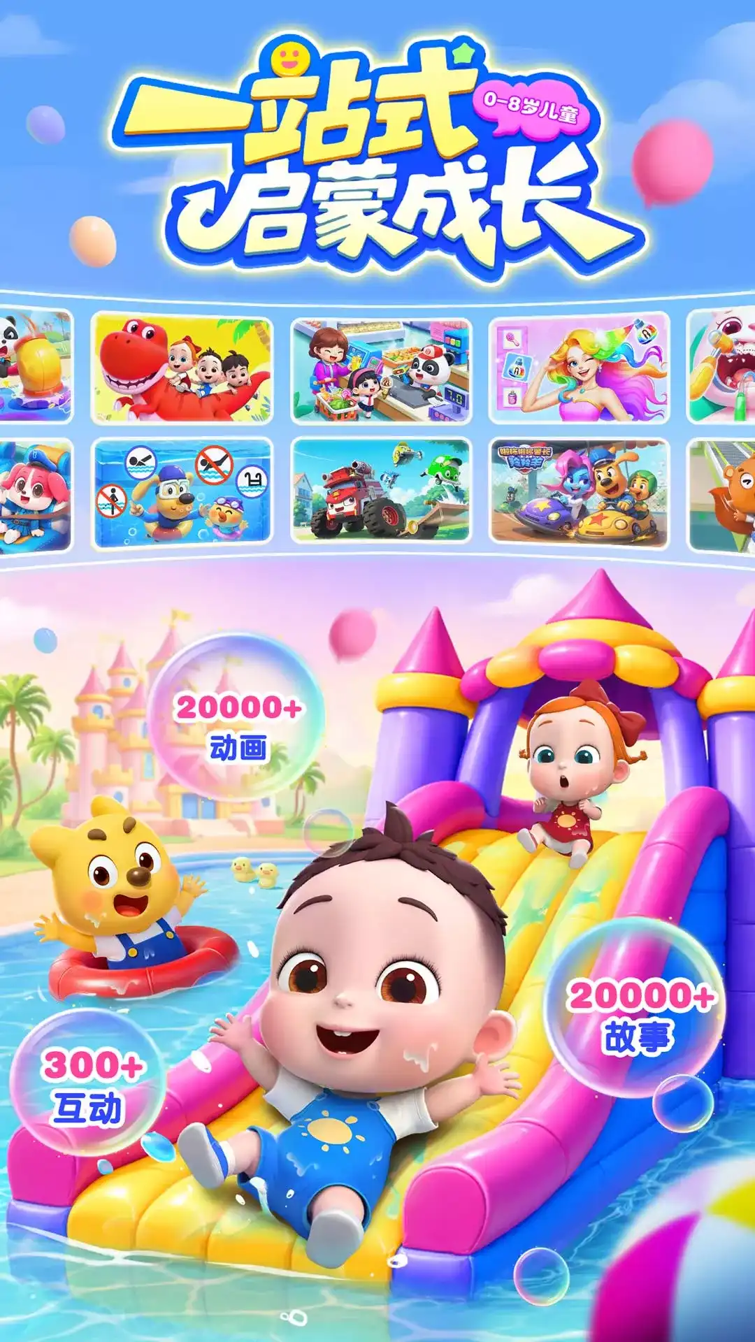 宝宝不适应学校环境?经常哭闹着不肯去上学? 让妈妈的早教育儿好帮手--【宝宝欢乐教室】来帮忙吧! 通过让宝宝模拟体验学校生活,缓解宝宝的上学焦虑。 和小伙伴分享玩具 和朋友们一起玩益智玩具吧,点一点小章鱼玩具,就能吐出好多泡泡。 把小火车放到轨道上,呜呜呜~火车开动了。拆开礼物盒,会弹出什么呢?试一试吧! 自己吃饭身体棒棒 宝宝要学习自己吃饭哦!戴围兜,坐在餐桌前,把饭菜放进嘴巴。宝宝想吃什么呢?三明治?牛排?还是水果?别忘了喝点水,这样才不会噎着。 养成规律作息习惯 午休时间到,快躺在床上,盖好小被子,关上灯,准备睡觉啦! 养成良好作息习惯,才能让身体棒棒哒,宝宝午安。 一起参加户外活动 小伙伴们都藏在哪里呢?滑梯后还是海洋球里?发挥观察力,找一找。 游泳比赛开始咯,戴上救生圈,和小伙伴们比一比,谁游得更快呢? 宝宝还可以体验滑滑板、荡秋千等活动。 更多宝宝早教益智互动,尽在【宝宝欢乐教室】。