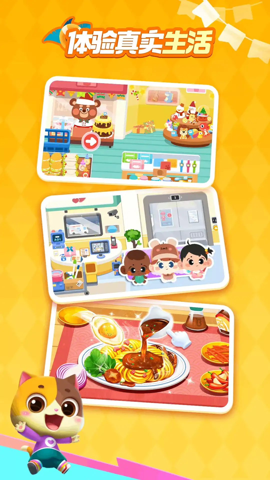 【宝宝超市】还原真实的购物场景,加入购物目的,让宝宝根据购物清单购买目标物品,帮助养成不乱买东西的好习惯;在超市购物过程中,宝宝将认知商品的名称、颜色、形状、大小……丰富日常生活认知;还能在【宝宝超市】制作美味蛋糕、趣味手工。 快来【宝宝超市】欢乐购物,学习生活百科。 缤纷商品逛不停 【宝宝超市】设置12大购物区域,29种商品类别,真实还原线下超市。 在逛超市过程中,伴随着语言提示和趣味互动,宝宝将学会区分品类,认知商品的名称、颜色、大小等内容。 采买过程有目标 【宝宝超市】添加购物目的和清单,培养宝宝良好消费观。 每次采购都有不同“任务”,宝宝要根据购物清单进行选购,学会按需采买。宝宝可以前往全新的宠物专区,购买宠物用品,还可以设计宠物穿搭,让萌宠与众不同。 购物流程全体验 【宝宝超市】呈现完整购物步骤,并帮助宝宝认识不同的支付方式。 如何挑鲜花,散装果蔬要怎么买……购物步骤一个不落。采购结束,还需付款,为宝宝传递“金钱”的概念:想带走商品,需要用钱来交换。 体验完“线上购物”,相信宝宝学到了不少知识。App里还有哪些趣味互动?快来发现吧!