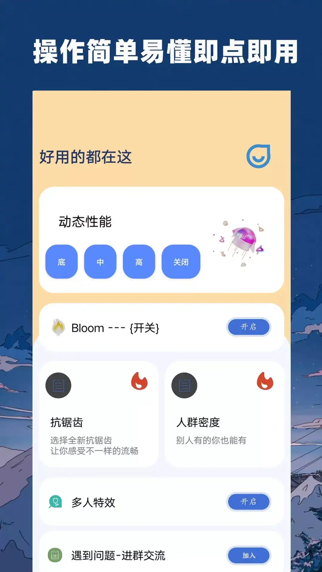 一款多功能帧率渲染。提供了从日常、图像质量与渲染视频帧率,阴影质量图片、后期效果等多方面的功能,操作简单,即点即用,避免您下载超多应用的难题,且应用体积轻巧,界面简洁。部分功能介绍:(特效质量,帧率),镜头高度自动回正(镜头偏移设置自动矫正),动态模式(设置动态效果与视频质量底中高),BIoom功能(一键自动开启),抗锯齿(TAA不一样的流畅),人群密度(密度显示设置),多人特效(便捷开启所有流动性特效),性能模式(多性能自动调节)