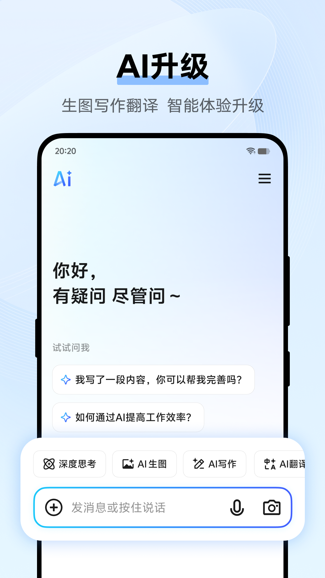 「万能扫描」全新升级!40余种功能,打包带走!<br>扫描文件,PDF格式转换,测量计数,更有图片压缩、拼图、换背景等图片处理工具,快来体验吧!<br>___________<br><br>无广告纯净浏览器+工作学习神器!<br><br>【综合搜索】快速切换「10余种搜索引擎」,没有什么是找不到的!<br><br>【极速搜图】专业的图片搜索引擎,一个关键词,全网图片展示在你面前。<br><br>【小说阅读器】看小说,看长文,自动排版,可调字体字号背景颜色,长续航不疲劳!<br><br>【全能播放器】网上看视频,投屏、倍速、截取Gif、小窗播放,让视频服服帖帖!<br><br>【万能扫描】扫描纸质文件、试卷擦除笔迹、识别文字,测量计数,高效处理一切文档。<br><br>【极速翻译】100+种语言翻译,方言小语种不在话下。对话、拍照、文档、翻译屏幕,一站式解决。<br><br>【图片处理】图片压缩、换背景、抠图、去水印、拼图等,10余种图片处理功能!<br><br>【PDF格式转换】PDF合并、拆分,PDF转Word、Excel、PPT、图片等多种格式互相转换。