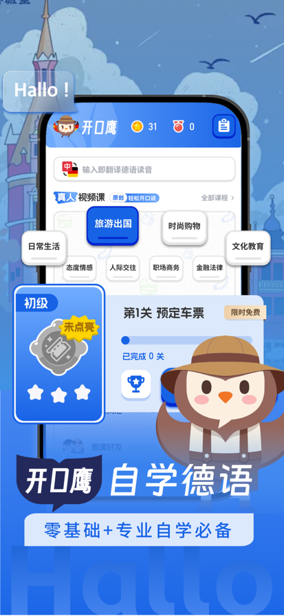 开口鹰德语学习,集合丰富的德语单词词汇,地道德国真人发音,沉浸式德语场景教学,德语留学知识点,助您轻松学德语。同时,内置强大翻译功能,阅读无障碍。随时随地,提升语言能力,开启您的德语学习之旅! 无论您是留学准备、工作需求,还是出于对德国文化的热爱,开口鹰德语学习都将是您不可或缺的德语学习伙伴。 【开口鹰德语-真人发音教学】 应用内置高清真人发音视频,每个字母发音、每句日常对话均由专业德语教师录制。 通过开口鹰独特的发音训练体系,您能在模仿中精准掌握德语发音细节,快速练就地道自信的口语能力。 【开口鹰德语-场景化教学】 首创八大主题场景覆盖全领域:从日常生活到金融法律,从旅游购物到职场社交。 每个场景由[开口鹰教研团队]精心设计,配合标准真人发音,带您沉浸式体验真实的德语环境。 这种"学以致用"的教学模式,让语言学习生动有趣。 【开口鹰德语-全能翻译系统】 搭载智能翻译引擎,支持单词速查与整句互译。 无论是研读德文文献,还是与德国友人畅聊,开口鹰的实时翻译功能都能助您打破语言壁垒,享受跨文化沟通的乐趣。 【开口鹰德语-高清视频课程】 专为初学者设计的进阶式教学体系,从字母认知到流利对话循序渐进。 每一步都清晰明了。更有创新的“旅游+学习”视频课程,让您在欣赏德国美景的同时,轻松学习实用德语。趣味性与实用性并重,让您的德语学习之旅充满乐趣与动力! 【开口鹰多语种学习平台】 作为语言学习领域的生态构建者,开口鹰汇聚日语、韩语、俄语、法语、西班牙语等主流语种,更深度开发泰语、阿拉伯语、意大利语、丹麦语等30+冷门语言资源库。深耕全球语言脉络,构建突破常规的学习体验。 让我们一起,用语言探索世界,让开口鹰成为您走向世界大陆的金钥匙!