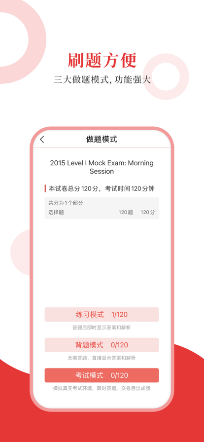 专为CFA考试精心准备的考试配套题库,每一道试题都有答案解析,为考试提供了充分的复习准备,可随时随地学习练习,支持手机、平板多端同时使用。 【内容】 Level Ⅰ 【圣题库介绍】 1.产品内容特点 ①更新及时,根据最新大纲或教材修订补充; ②题量大,多个刷题板块,历年真题、章节习题、模拟试题; ③考点全,部分有视频讲解重难点,随题观看; ④解析完善,深入浅出。 2.软件功能特点 ①三大做题模式,适应不同需要; ②详细做题记录,把握复习进度; ③关键词搜索试题,哪里不懂搜哪里; ④错题自动收录,好题手动收藏,查漏补缺; ⑤分析错题记录,个性化智能出题。