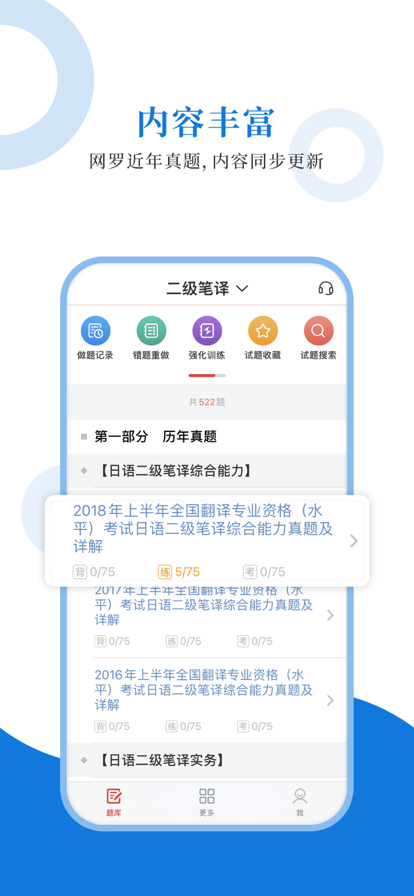 专为全国翻译专业资格水平考试日语考试精心准备的考试配套题库,每一道试题都有答案解析,为考试提供了充分的复习准备,可随时随地学习练习,支持手机、平板多端同时使用。 【内容】 二级笔译 【圣题库介绍】 1.产品内容特点 ①更新及时,根据最新大纲或教材修订补充; ②题量大,多个刷题板块,历年真题、章节习题、模拟试题; ③考点全,部分有视频讲解重难点,随题观看; ④解析完善,深入浅出。 2.软件功能特点 ①三大做题模式,适应不同需要; ②详细做题记录,把握复习进度; ③关键词搜索试题,哪里不懂搜哪里; ④错题自动收录,好题手动收藏,查漏补缺; ⑤分析错题记录,个性化智能出题。
