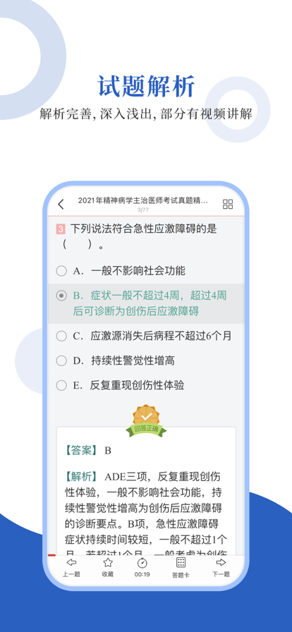 专为精神病学考试精心准备的考试配套题库,每一道试题都有答案解析,为考试提供了充分的复习准备,可随时随地学习练习,支持手机、平板多端同时使用。 【内容】 主治医师 【圣题库介绍】 1.产品内容特点 ①更新及时,根据最新大纲或教材修订补充; ②题量大,多个刷题板块,历年真题、章节习题、模拟试题; ③考点全,部分有视频讲解重难点,随题观看; ④解析完善,深入浅出。 2.软件功能特点 ①三大做题模式,适应不同需要; ②详细做题记录,把握复习进度; ③关键词搜索试题,哪里不懂搜哪里; ④错题自动收录,好题手动收藏,查漏补缺; ⑤分析错题记录,个性化智能出题。