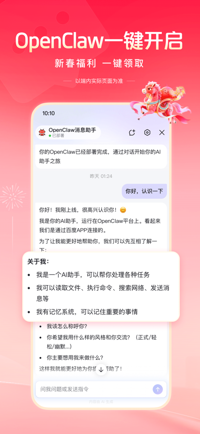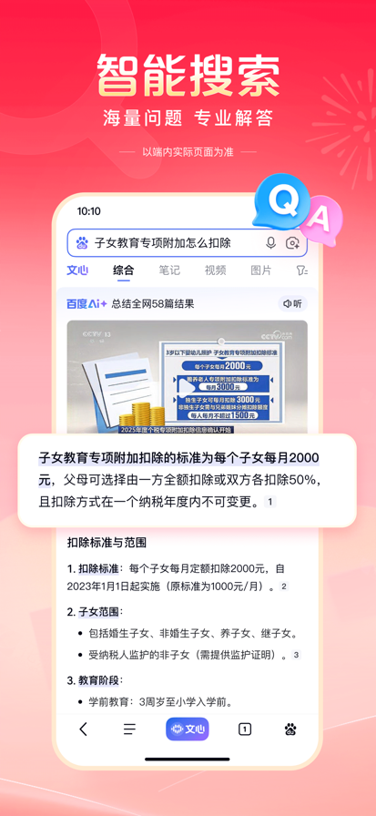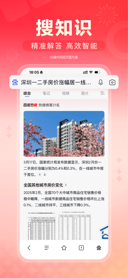 【智能搜索】 强大的搜索引擎,搭载文心一言大模型,多模态搜索,所见即所得,更深度、精准理解你的搜索意图,快速识别图片内容,直达你想要的结果。 【热门资讯】 精选新闻资讯、视频、漫画等优质内容,热门评论置顶显示,查看、互动更方便。 【文心助手】AI全能助手,即时解决你的所有问题。深入研究、深度搜索,为你解决复杂问题;AI拍题,一键解惑学习难题;AI生图、AI生成视频、AI写作,精彩内容跃然屏幕,还能AI语音通话、视频通话、文字聊天,带给你全新的AI体验! 【短视频】 首页底部快速进入视频频道,海量明星娱乐、搞笑段子、经典剧集视频,还能拍小视频记录身边新鲜事,简单操作能拍又能看。 【语音识别】 加入更懂中文的语音识别技术,新增方言识别能力,支持语音播报资讯,精准理解你的语音指令,即使在嘈杂环境中也能清晰识别,沟通无障碍。 【小说/短剧】 海量正版小说、短剧随心看,小说支持书架列表、阅读进度可多台设备自动云同步。短剧涵盖都市、爱情等多种题材,智能推荐,精准匹配你的短剧喜好。
