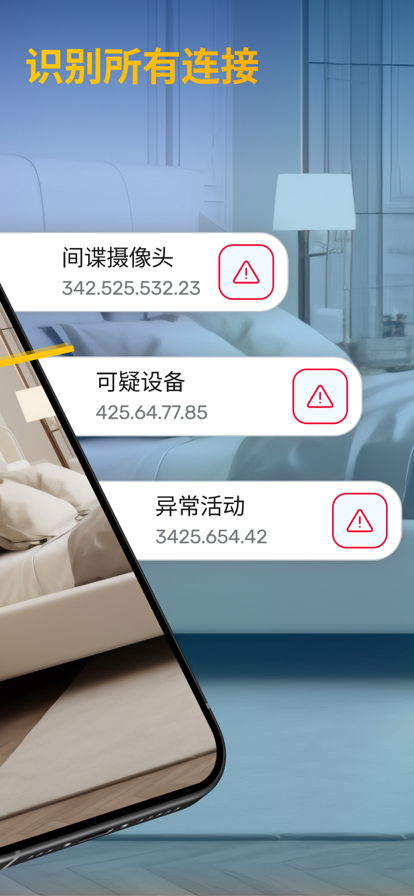 摄像头探测器是一款用于检测隐藏摄像头的软件。用户可以用来检测当前环境是否安全,是否存在隐藏式摄像头,防止个人隐私泄漏,防偷拍。 采用强大的算法,检测摄像头。将镜头对准需要探测的区域一键检测。酒店、民宿、电视机等,内设多种排查点,逐一排查,放心出行 主要功能: 1、红外线检测: 利用手机摄像头识别针孔摄像头的红外线光来检测和判断摄像头位置 2、多功能排查,一键查询当前Wi-Fi网络状态,实用便捷的网络连接查询 3、一键网络测速,密码记录等功能 隐私链接:https://www.freeprivacypolicy.com/live/f1e79d5d-311c-46fb-84fa-d6b2ebe69e9c 用户协议:https://www.freeprivacypolicy.com/live/274c0450-c4c9-429a-9eeb-155c9d8b0ea5