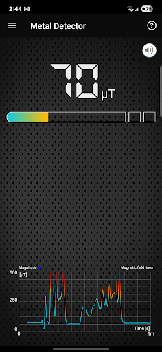 具有声音和振动的金属和金检测器是一种用于检测附近是否存在金属物体的应用程序<br><br>测量磁场值。这个有用的实用工具使用智能手机和平板电脑内置的磁传感器<br><br>以μt(微特斯拉)为单位显示磁场强度。<br><br>自然界中的电动势约为49μt(微特斯拉)或490mg(毫高斯); 1μt= 10mg。传感器以某种方式工作<br><br>金属接近时,应用程序中的磁场值将增加,这将确认某些金属物体的存在。<br><br>应用的可用性将帮助您识别该区域,墙壁后,地下和其他地方的任何金属物体。如<br><br>所有金属都会产生磁场,并且可以使用此工具测量其强度。<br><br>用法很简单。只需启动该应用程序并移动它即可。如果有金属存在,您会看到<br><br>屏幕上显示的磁场水平会不断波动。彩色线条代表强度和<br><br>顶部的数字表示磁场强度(emf)的值。<br><br>达到一定极限时,设备将振动并发出声音,表明金属已接近。您可以校准并<br><br>从设置更改振动和声音效果的灵敏度。<br><br>注意:工具读数的准确性完全取决于您的移动设备中的传感器,还请注意,由于<br><br>电磁波,磁传感器可能会影响附近的电子设备。<br><br>特征:<br>🔳应用程序使用内置磁力计来测量周围环境中的电磁场(emf)电平<br>of电磁场的检测值会告诉您是否有金属封闭<br>🔳应用程序还可在墙壁和地板上工作,因此它可以检测隐藏的电线,螺柱和金属<br>em电动势的强度显示在磁场强度图表上<br>discovery发现金属后更改播放的声音和振动选项