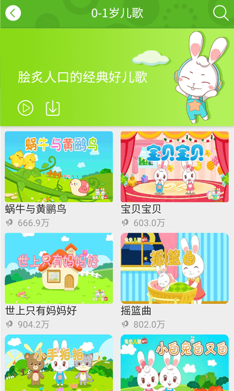 兔兔儿歌,科学划分适龄儿歌,适合0~6岁小朋友使用! 兔兔儿歌是哄娃必备的亲子早教儿歌儿童故事APP,汇集了经典儿歌童谣,儿童睡前故事,童话故事,寓言故事,成语故事,胎教音乐,唐诗国学,英文儿歌,绘本故事等儿童启蒙动画片内容。 优质精选的原创动画视频内容,趣味益智,安全健康,既适合新手爸爸妈妈哄娃带娃讲故事,也适合孕期胎教,已获得百万用户认可和下载使用。 【内容特色】 1、精品儿歌大全,原创动画,风格清新时尚。 小燕子,世上只有妈妈好,小毛驴,摇篮曲,小星星,上学歌,小红帽,丢手绢,两只老虎,数鸭子,粉刷匠,拔萝卜,丢手绢等热门儿歌。 2、儿童睡前故事精选,哄娃睡觉超级管用。 白雪公主,灰姑娘,小红帽,女娲补天,青蛙王子,龟兔赛跑,小兔子乖乖,狼来了,小蝌蚪找妈妈,孔融让梨等热门儿童故事。 3、经典唐诗名句的全新演绎,生动有趣,寓教于乐。 咏鹅,赠汪伦,早发白帝城,静夜思,悯农(锄禾日当午),登鹳雀楼…… 【功能亮点】 1,自定义歌单。可按宝宝哄睡,乖乖吃饭,早教学习等各种使用场景,自定义适宜的内容。我们非常用心的在做产品,目前儿歌APP中独此一家支持此功能。 2,定时关闭。设定时间,定时停止播放,适合哄睡或避免宝宝长时间使用。 3,护眼模式。可以从看动画切换到听音乐,保护宝宝眼睛,防止过久观看。 4,后台播放。可以一边后台播放哄睡,一边刷微信看新闻。 【用户评价】 孩子很喜欢,比玩游戏好,不伤眼睛; 钢琴音乐很好听,很静心,也挺有助于睡眠; 洗衣做饭的时候,不能时刻盯着孩子,让宝宝看儿歌动画不乱跑,省心放心。