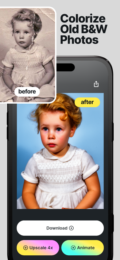 用人工智能为老照片注入新生 将模糊、褪色或受损的记忆转化为惊艳的高清杰作。我们的先进人工智能技术让专业级修复工具触手可及。 核心功能: - AI上色:轻点一下,将黑白家族档案转化为色彩鲜活、自然逼真的彩色照片。 - 照片修复:轻松清除老照片上的划痕、破损与灰尘。 - AI人像动画:让往昔重现生机!将静态肖像转化为逼真的5秒动态视频,见证祖先的微笑与挥手。 - 画质提升:将低质像素化图像转化为晶莹剔透的4K分辨率。 - 人脸优化:锐化面部细节,改善肤质纹理,呈现完美容颜。 注:免费版每日修复照片及动画制作次数有限。订阅高级会员即可畅享全部功能。 为何选择我们? - 快速简便:数秒呈现专业级效果 - 传承守护:家谱研究者与家族档案馆的理想之选 - 卓越品质:采用业界领先的AI算法 立即下载,重温历史记忆! 使用条款 - https://www.cultcode.tech/terms-of-use-colorizer/ 隐私政策 - https://www.cultcode.tech/privacy-policy-colorizer/ Personal Data: (Privacy Policy: 2) Data Access and Removal / Third-party Disclosure) The security of your personal information is always important to us. In order to fully access our features and for the app to work properly, we require your authorization to access the Camera and Gallery. This is necessary for the app to analyze your photo and generate a result. Only if you confirm your authorization access your camera or gallery. We will then process the image as described above and delete them after processing. We will not store or share this data with third parties. 欢迎随时联系我们:cultcode.tech@gmail.com 您的反馈与建议对我们至关重要!