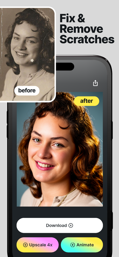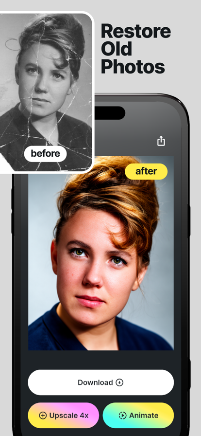 将您陈旧、模糊的照片轻松转化为令人惊叹的高分辨率杰作,借助PhotoMod先进的AI增强器。利用先进的人工智能技术,PhotoMod可以通过轻触一下去模糊、恢复和增强任何图像。 PhotoMod使您能够为老照片注入新的生命,呈现出清晰的高清画质。 -------- 主要特点 -------- 增强您的照片 PhotoMod的AI照片增强器可以提高分辨率4倍,修复色彩和光照,恢复划痕或模糊的照片,并使几十年前拍摄的照片看起来像是用现代iPhone拍摄的。仅需几秒钟。 消除模糊 使用PhotoMod的去模糊功能从照片中消除模糊。无论是肖像、自拍还是团体照,见证令人难以置信的转变,呈现出引人注目的面部细节。只需轻触即可磨利和去模糊不清的照片 - 解决模糊图像的终极方案。 提高分辨率 观察您的照片经历令人注目的转变,因为PhotoMod将图像分辨率提高了200%、500%,甚至超过1000%,呈现出令人惊叹的高清画质。将您的图片提升至高清图像的境地。 为黑白照片上色 通过轻触为单色记忆增添活力。给您老旧的黑白家庭照片上色,让它们重焕生机。利用图像和照片修复功能,先增强质量,然后注入色彩,恢复您珍贵的老照片。 去划痕和恢复老照片 立即修复老照片,解除它们的划痕、切割或任何其他损伤。PhotoMod的先进AI会熟练修复您的照片,使它们看起来崭新如初。 一键分享照片 PhotoMod为您提供一张完美的照片,随时可以在Instagram、TikTok、Snapchat、Facebook或您的群聊中分享! Terms Of Use can be found at: https://www.apple.com/legal/internet-services/itunes/dev/stdeula/ Privacy policy: https://www.termsfeed.com/live/f6753bdc-f152-4354-bf7e-7ad208b1ed9e