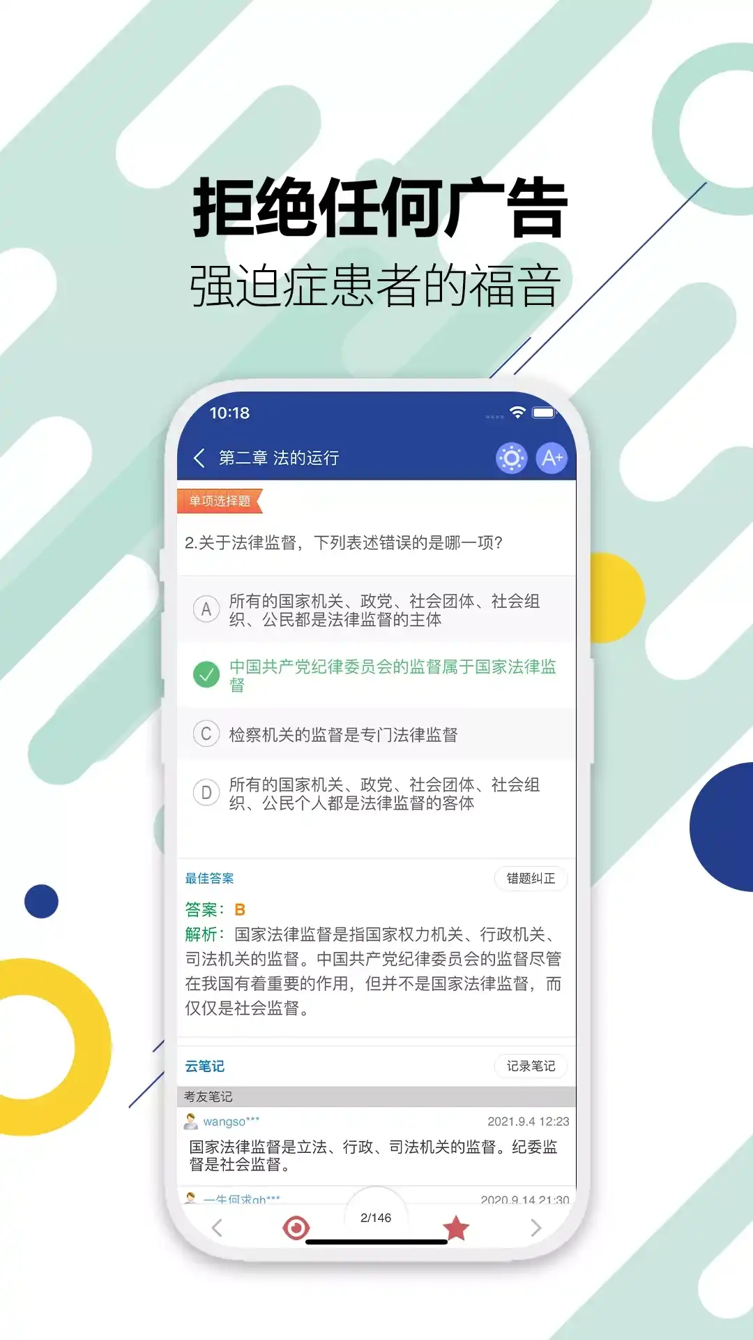 法考考试宝典 用户喜爱的刷题APP,考生推荐使用。 刷题,模考,学习计划,能力测评这些都能满足你! 软件特色 ●海量试题库:章节练习、历年试题、高频考点、模拟试卷、综合练习等全方位强化分类学习 ●高频考点,核心考点,能力测评,大数据技术全面击破薄弱点,定制专属学习计划 ●答题解析,试题讨论,答错答对有专家帮忙解释,深入掌握试题,还有百万考生精彩评论 实用功能 1自动汇总错题,汇总其它考生错题 2智能评估阅卷,快速查看成绩 3收藏薄弱试题,随时排查重做 4抽题组卷,模拟考场,积累实战经验 5掌上笔记,我的笔记,大家的笔记 6试题讨论精华,考生精选试题讨论,助力试题解惑 学习方便省时 学习时间、地点不受限制,电脑、手机、平板、多终端同步学习,任意切换使用。 出品:英腾智库教育科技(北京)有限公司 全国免费客服热线&QQ:4007278800