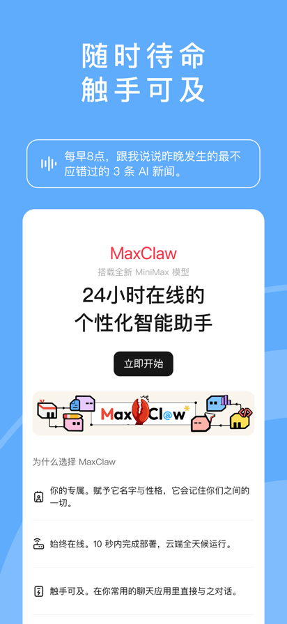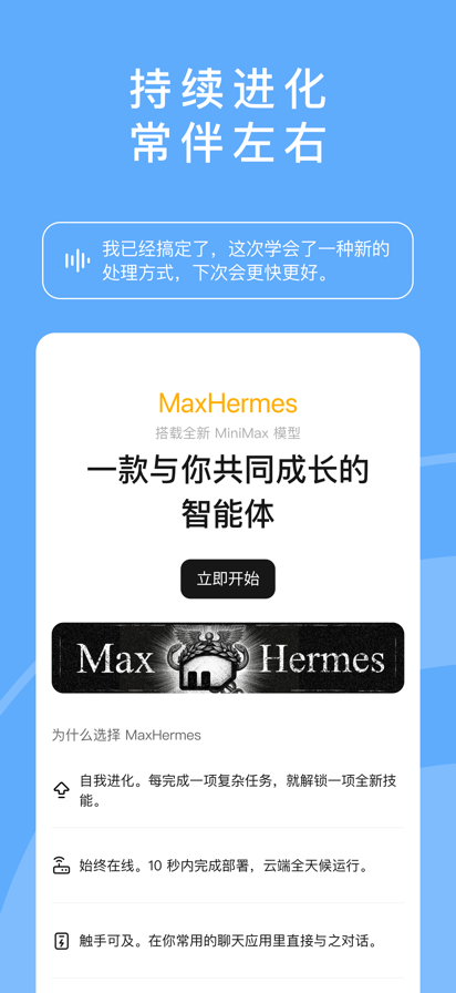 MiniMax Agent是一个能完成长程复杂任务的通用智能体,在Multi-agent系统的支撑下,能多步规划出专家级解决方案、能灵活拆解任务需求、并能执行多个子任务从而交付最终结果。 MiniMax 智能体的能力包括: - 高效模式:全面提升聊天场景体验,更高效地处理问答、文档总结和创意写作等日常任务。 - 深度研究与分析:整合全网信息,生成深度研究报告。 - 多模态内容生成:轻松创作视频、音频和图片,丰富您的内容呈现。 - 专业演示文稿制作:一键生成内容精美、视觉丰富的专业演示文稿。 - 全栈应用构建:创建稳定且视觉效果出众的全栈应用程序,覆盖从前端到后端。 - 代码编写与调试:您的智能编程伙伴,助您高效完成代码编写与测试。 隐私政策: https://chat.minimaxi.com/doc/privacy-policy.html 用户协议: https://chat.minimaxi.com/doc/terms-of-service.html 服务协议: https://agent.minimax.io/doc/zh/payment-policy.html