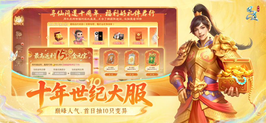 【更新介绍】 问道手游10周年庆,4月24日盛大开启! 千万玩家,十年集结,福利拉满!上线即可免费领宝葫芦坐骑皮肤、10周年纪念法宠·浪浪山小野猪、10周年纪念外观等丰厚大礼。当天游戏内还将举行生日抽奖,全区组抽全新葫芦娃变异、一箱黄金纪念钞等大奖! 十年经典相遇,重磅联动上美影,推出《浪浪山小妖怪》联名10周年纪念宠,可4阶养成变灵兽;推出葫芦娃变异,堪称力宠变异战力天花板。 十年限定荣誉赛事,争夺天下道王,冠军可立天墉城雕像,享全体道友膜拜! 【10周年】世纪大服现已开启预约,千万粉丝达人大圆哥、蓝战非强势入驻!十年问道,初心不改,邀千万道友共赴人生之约! 【版本特色】 十年世纪大服 【10周年】世纪大服重磅来袭,福利与人气破历史新高!预充值享15%高额返利,月卡首次买一送一,最高送360天年卡权益,开服首日抽10只变异,往后连续14天继续每日抽1只变异,上线天天有惊喜。超人气顶流主播大圆哥、蓝战非强势入驻【10周年】,和千万道友一起结帮派,做队友,一起做装备试道。10周年生日,万千道友一起书写新的问道传奇。 全体道友福利 10周年全服回馈,福利力度空前。人人上线即可享好礼,道友只需登录游戏,即可直接领取永久宝葫芦坐骑皮肤与10周年专属纪念外观!周年庆当天将进行共庆周年抽奖,有机会赢一箱10周年黄金纪念钞、手机等好礼,同时每个区组抽出2名幸运道友获得最新葫芦娃变异。让每一位陪伴问道的道友都能收获满满! 葫芦娃变异 10周年联名童年经典动画,推出全新变异宠:葫芦娃。承袭葫芦兄弟经典形象,可变7色,配合7种技能特效,喷火、隐身、吐水样样精通!属性堪称力宠变异战力天花板,情怀与实力并存,为道友再添强力猛将! 小妖纪念宠 10周年纪念宠与《浪浪山小妖怪》重磅联动:浪浪山小野猪(法宠)、浪浪山小猩猩(力宠)。正如动画里平凡小妖一路成长、终成不凡,游戏里两只纪念宠也可4 阶养成变灵兽,外形与实力同步进阶。让来自浪浪山的小伙伴陪你修行打怪、并肩逐梦,最终活成自己向往的模样! 【联系我们】 欢迎道友们随时给我们评价、留言。 问道手游官方网站:wd.leiting.com 问道手游客服微信:leitingkefu 问道手游官方微信:wendaoshouyou