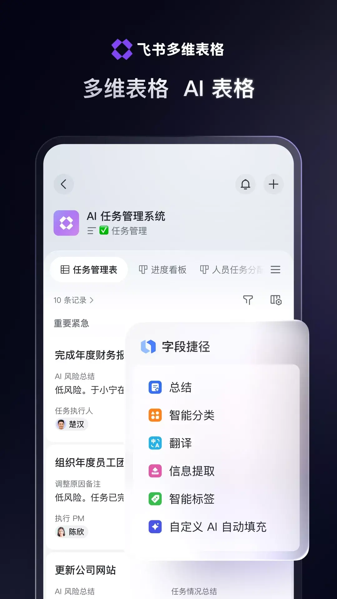 飞书是 AI 时代的先进生产力平台,集协同办公、组织管理与业务提效于一体。凭借深度融合的 AI 能力,飞书让 AI 真能用、真落地,助力企业高效协作、智能决策、持续创新。从互联网、高科技、消费零售,到制造、金融、医疗健康等,各行各业先进企业都在选择飞书,与飞书共创行业标杆实践。先进团队,先用飞书。 #飞书 AI 新功能概览:让 AI 真能用、真落地# 飞书将 AI 融入企业知识和业务流程,提供真能用的工具和真落地的服务,与各行业先进企业共同探索 AI 落地实践,做企业长期值得信赖的 AI 伙伴。 - 飞书知识问答:开箱即用的企业专属的 AI 问答工具,基于企业在飞书内沉淀的所有知识、工作记录,不依赖知识库的整理,即可回答业务问题、创作工作文档,并严格遵循用户权限,答案千人千面,让知识转化为 AI 生产力。[应用成熟度:M3] - 飞书智能会议纪要:AI 时代的智能会议解决方案,提供会中实时总结,会后全面回顾,精准的会议纪要、待办提炼,让会议结论更好的落地、会议内容充分沉淀、可进一步被 AI 消费,让每场会议都成为组织数字资产。[应用成熟度:M4] - 飞书 aily:aily 工作助手是飞书提供的面向企业工作场景的智能体(AI Agent),不仅能检索企业内外的知识回答来你的各种问题,也擅长思考和规划,调用各种工具完成复杂任务,为企业员工提供全方位的智能化工作支持。[应用成熟度:M3] - 飞书多维表格 AI:多维表格全面升级,融合豆包、DeepSeek R1 等领先大模型,具备开箱即用的 AI 能力,让 AI 融合业务,带来百倍好的全新体验;飞书多维表格 AI,让你业务一张表,AI 满血跑![AI 字段捷径应用成熟度:M3] 此外,飞书还提供即时通讯、音视频会议、云文档、知识库、日历、审批、邮箱等一站式协同办公能力,让信息流动更顺畅,让每一个人工作更高效、更愉悦,并为 AI 沉淀企业数字资产。 【联系我们】 邮箱:contact@feishu.cn 如有问题或建议,欢迎通过邮件与我们联系。 先进团队 先用飞书