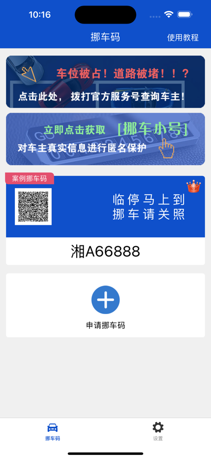 《一键挪车码App》包含挪车码、挪车小号、找车主三大核心功能。在车位紧张的年代,每个车主都避免路边临时停车的情况,面临车主本机电话号码泄漏、电话骚扰、推销短信等问题。通过我们的软件,在车里贴一张挪车码或者挪车电话号码,以便挪车之需,所有问题一一解决,快来下载试用我们的软件吧! 操作简单! 快速申请挪车二维码,挪车码卡片支持多种颜色,适合不同群体! 挪车方便! 私密通话,保护主机号码隐私的电话软件! 保护隐私! 挪车小号护航,匿名接打电话,防止电话骚扰! 快速便捷! 扫描二维码,快速通知车主挪车! 快速找车主! 车位被占?道路被堵?直接拨打官方服务号,快速查询车主信息!