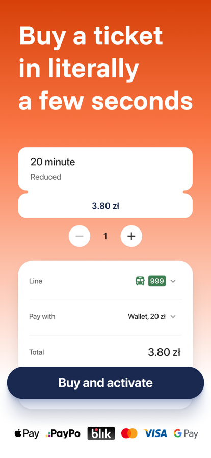 zBiletem is the simplest and most convenient app for buying public transport tickets. Buy tickets without standing in line, searching for an open kiosk or store, or counting exact change. With the zBiletem app, just 3 clicks are enough to buy the ticket you need. Whether you use ZTM Warsaw, MPK Łódź, ZTM Lublin, MPK Włocławek, or MPK Częstochowa, zBiletem makes it easy to pay for your ticket. You can pay using your Wallet, Blik, Google Pay, payment card, or PayU transfer. Remember that tickets remain visible in the app even when you're offline. This way, you'll never be caught off guard during a ticket inspection on a bus or tram. zBiletem also offers the ability to purchase periodic tickets, which are the most convenient and affordable way to pay for public transport if you travel regularly. Purchase the ticket on zBiletem.pl and then store it in the app. It's really simple. With zBiletem, you can buy tickets from the following transport operators and organizers: ZDMiKP Bydgoszcz, PKM Czechowice-Dziedzice, MPK in Częstochowa, ZKM Elbląg, ZTM Gdańsk, ZKM Gdynia MZKZG, MPK Gniezno, MZK Grudziądz, MZK Gorzów Wielkopolski, MPK Inowrocław, MZK Jastrzębie-Zdrój, Kaliskie Linie Autobusowe KLA, MPK Kraków (KMK), MZK Kutno, MPK Legnica, ZTM Lublin, MPK Lublin, MPK Łódź, Metropolia GZM (e.g., Katowice, Gliwice, Bytom, Chorzów, Sosnowiec, Tychy), ZDZiT Olsztyn, MZK Opole, MZK Ostrowiec Świętokrzyski, MZK Pabianice, ZTM Poznań, MZK Przemyśl, MZDiK Radom, ZTZ Rybnik, ZTM Rzeszów, MPK Rzeszów, MPK Sieradz, MZK Skierniewice, ZIM Słupsk, MPK Stargard, ZDiTM Szczecin, MPK Świdnica, ZDiK Tarnów, MPK Tarnów, MZK Tomaszów Mazowiecki, MZKZG, MZK Toruń, ZDKiUM Wałbrzych, ZTM Warszawa, MZA Warszawa, Tramwaje Warszawskie, Metro Warszawskie, SKM, MZK Wejherowo, MPK Włocławek, ZKM Zawiercie, MPK Zduńska Wola, MUK Zgierz, MZK Zielona Góra. zBiletem enables you to purchase monthly tickets in cities such as: Bydgoszcz, Czechowice-Dziedzice, Częstochowa, Gdańsk, Gdynia, Gniezno, Grudziądz, Gorzów Wielkopolski, Inowrocław, Jastrzębie-Zdrój, Kalisz, Kutno, Legnica, Łódź, Olsztyn, Opole, Ostrowiec Świętokrzyski, Pabianice, Przemyśl, Rybnik, Rzeszów, Sieradz, Skierniewice, Słupsk, Sopot, Szczecin, Świdnica, Tarnów, Tomaszów Mazowiecki, Toruń, Wałbrzych, Wejherowo, Włocławek, Zawiercie, Zduńska Wola, Zgierz. If you have any questions about zBiletem, contact us at kontakt@zbiletem.pl