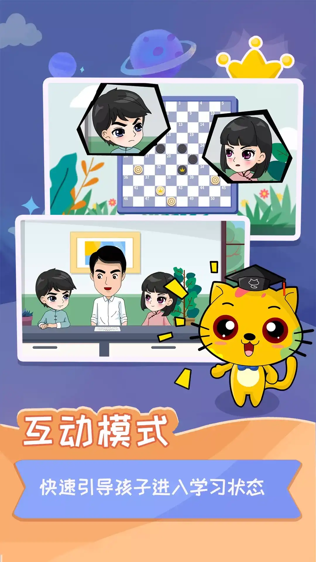 《少儿国际跳棋教学合集》是一款专为3-13岁宝宝设计的创新交互式国际跳棋动画教学APP,一款适用儿童早教启蒙教育学习软件,遵循儿童认知和学习的特点,在知识点的选择和编排上完全按照孩子的思维习惯设计,让孩子在快乐中学会国际跳棋;通过角色扮演互动演绎和动画的结合,使得枯燥的知识变得直观易懂。而且通过各式各样的国际跳棋对弈玩法培养孩子的专注力、观察力、判断力、数学思维能力、逻辑思维能力等全面能力提升。 1、动画授课 用幼儿喜欢的动画方式,让孩子主动思考的同时又对后面的学习充满好奇,时刻保证孩子的学习兴趣。 2、循序渐进 结合儿童的认知和学习特点,自主研发并编排了一套适合孩子学习的课程结构,全面剖析国际跳棋的知识要点,让孩子快乐的学习并掌握知识点。 3、互动模式 教学内容采用人物互动方式来展开,生活化的对话结合动画的表达形式,亲切自然,使得抽象枯燥的国际跳棋知识润物细无声的被孩子不知不觉就接受和了解。 4、边学边想,课后练习 每课结束通过儿歌总结的方式,让孩子轻松且不乏味的记住课程要点,并配合课后练习,对所学知识进行复习和巩固。还有国际跳棋人机对弈功能,让孩子运用所学。