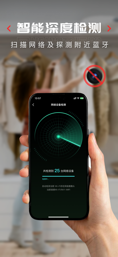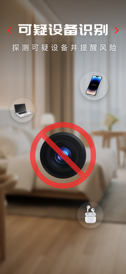 摄像头探测器是一款用于检测隐藏摄像头的软件。用户可以用来检测当前环境是否安全,是否存在隐藏式摄像头,防止个人隐私泄漏,防偷拍。 采用强大的算法,检测摄像头。将镜头对准需要探测的区域一键检测。酒店、民宿、电视机等,内设多种排查点,逐一排查,放心出行 主要功能: 1、红外线检测: 利用手机摄像头识别针孔摄像头的红外线光来检测和判断摄像头位置 2、多功能排查,一键查询当前Wi-Fi网络状态,实用便捷的网络连接查询 3、一键网络测速,密码记录等功能 隐私链接:https://www.freeprivacypolicy.com/live/f1e79d5d-311c-46fb-84fa-d6b2ebe69e9c 用户协议:https://www.freeprivacypolicy.com/live/274c0450-c4c9-429a-9eeb-155c9d8b0ea5