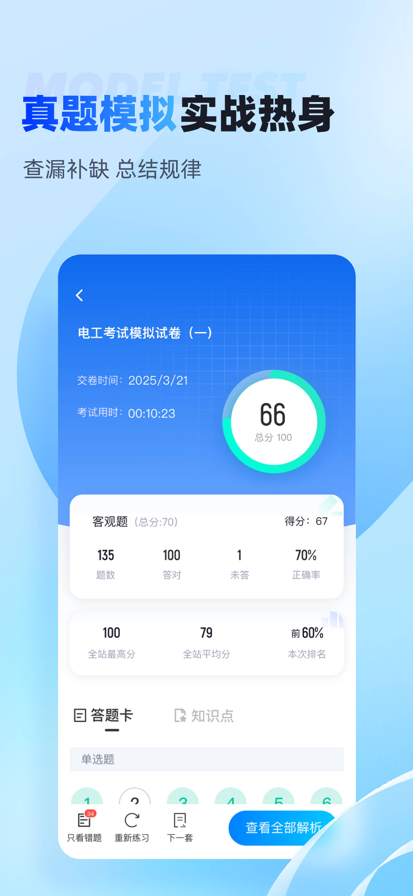 电工考试聚题库是一款专为电工从业人员及考证学员设计的备考辅助软件,涵盖低压电工作业、高压电工、电气试验、继电保护等各类电工职业资格考试的题库资源。该App整合了历年真题、模拟试题及高频考点,提供智能刷题、错题强化、模拟考试等功能,帮助用户高效备考。通过章节练习、随机组卷和详细解析,用户可系统掌握电工理论、安全操作及法规知识,适配全国通用考试标准,是电工考证必备的学习工具。 核心功能亮点: 海量题库:覆盖电工各工种考试大纲,实时更新考题。 智能刷题:推荐薄弱环节,针对性提升成绩。 模拟考试:全真模拟考场环境,提前适应考试节奏。 错题收藏:自动归纳错题,便于重点突破。 适用人群: 准备电工证(初级/中级/高级)考试的学员 需复审或升级电工职业资格的技术人员 电力行业从业者自我能力检测
