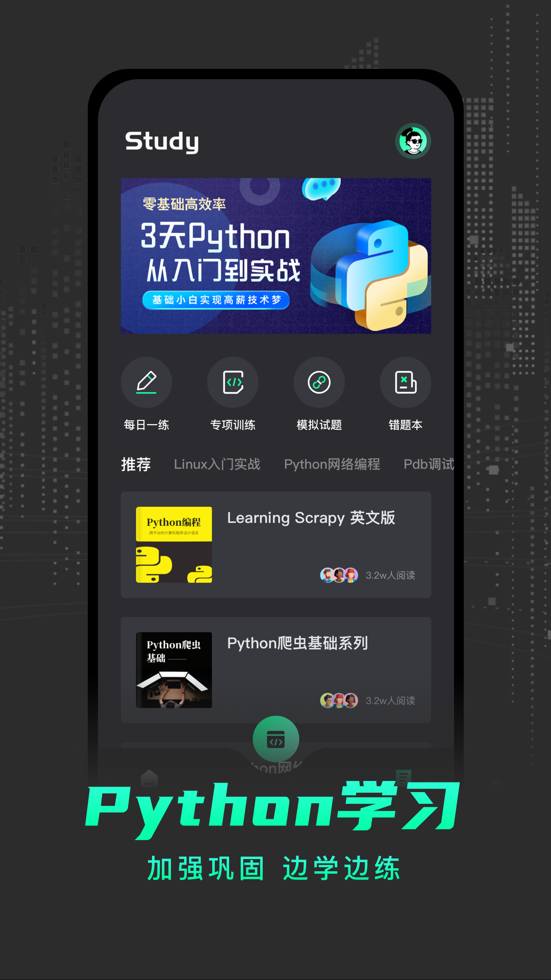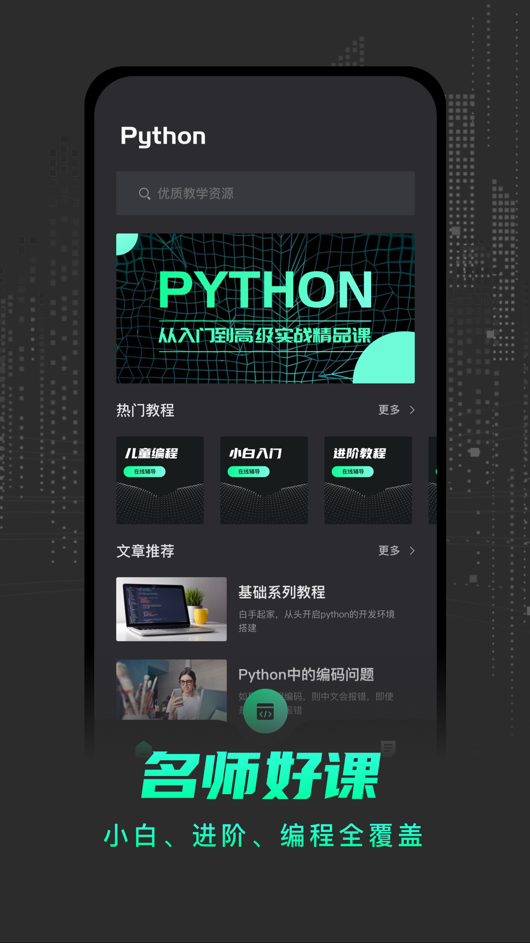 【为什么学python?】<br>相比C语言,C++,Java,PhP, Swift,Ruby, ADA, Pascal, Scala等编程语言,python语言更容易上手,应用范围更广,更适合编程小白<br><br>python编程是一款[python编程入门学习App,致力于帮助初学者入门及提升程序员开发效率,目前已提供1000+常见编程语言教程和免费技术文档,涵盖前端开发/Python/Java/PHP等热门编程语言。是学习python编程不过多得的工具。提供的内容全面,讲解精深,功能实用。是程序员的开发手册,学编程,从这里开始!<br><br>Python已超越C#,与Java,C,C++一起成为全球前4大流行语言,python具有 简单、易学、免费、开源、可移植、可扩展、可嵌入、面向对象 等 优点,它的面向对象甚至比java和C#.net更彻底,python编程是一款服务于Python编程语言学习者的app,提供了许多经典的视频教程供大家学习,希望对大家的学习有所帮助。<br><br>Python被广泛应用于后端开发、游戏开发、网站开发、科学运算、大数据分析、云计算,图形开发等领域,Python在软件质量控制、提升开发效率、可移植性、组件集成、丰富库支持等各个方面均处于先进地位<br><br>从小白到入门,快速掌握编程奥秘,写出一行代码,带你打开编程的大门!精通python语言、掌握爬虫技术,实现自动化办公、高效数据分析,入门人工智能,未来,就是现在!无论你来自什么行业,担任什么岗位,是否接触过相关领域,都可以玩转编程!全面掌握基础语法,提高工作效率,收获编程思维。
