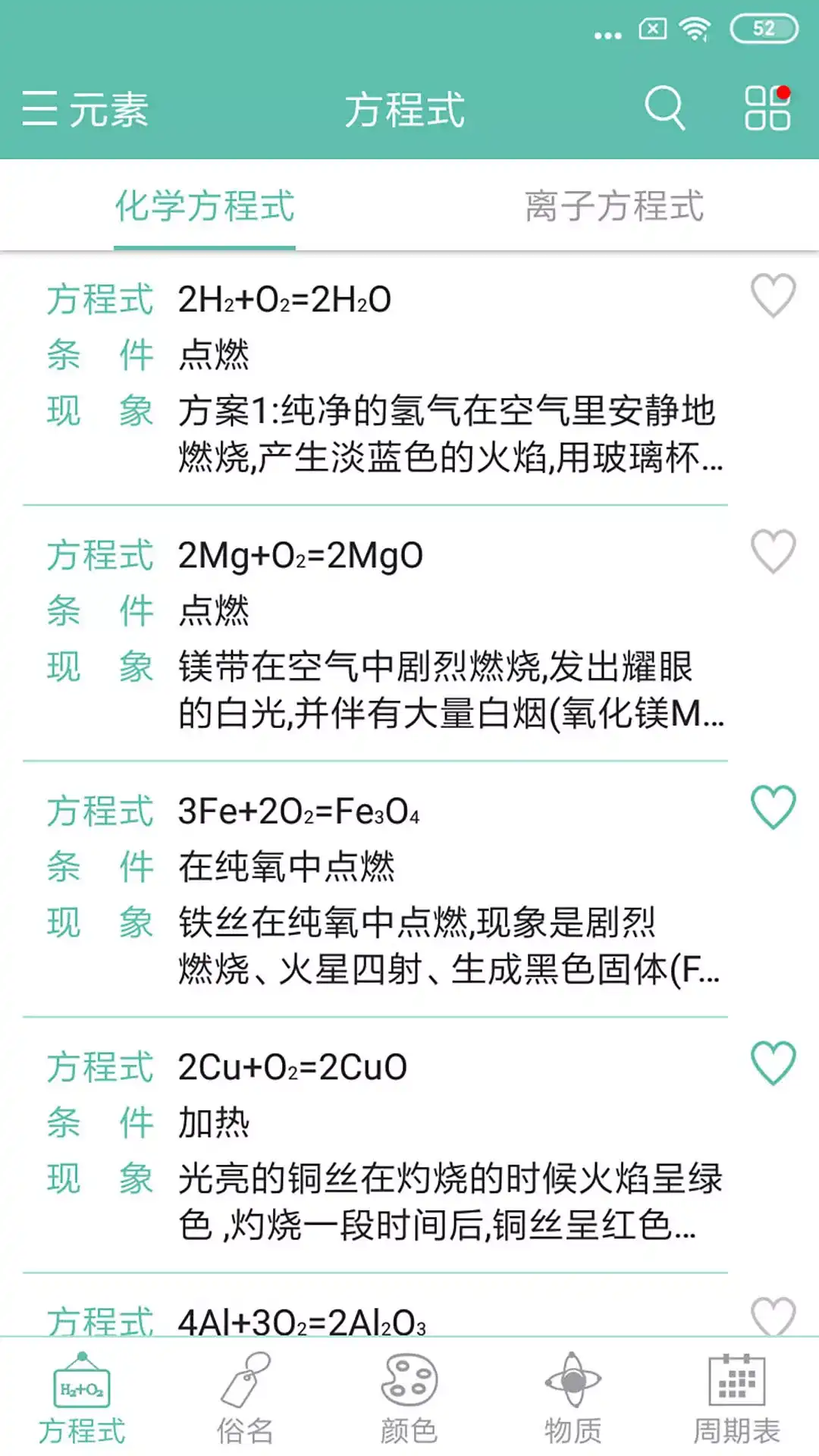 【软件简介】 化学方程式软件是为从事化学专业的用户开发的一款化学工具软件。化学方程式首页包含元素周期表、物质、方程式等模块。各模块循序渐进,相辅相成,可以更快速、全面的帮助用户提高对化学知识的理解;同时化学方程式具有查询方便、数据齐全、知识面广、连贯性强、讲解深入等特点,一直以来深受广大用户的一致好评。 【软件特色】 特色1:包含初高中教材中所有与方程式相关的知识点。 特色2:包含各省市历年与方程式相关考题的解说。 特色3:包含大学化学教材中的大部分基础表格数据。 特色4:包含丰富的化学工艺。 特色5:显示友好,查询方便。 特色6:数据持续完善、错误率极低。 【作者寄语】 化学是一门很神奇的学科,我们生活中的方方面面都离不开化学,化学的魅力之处在于她能够解释清楚我们所处环境中的各种现象与本质。希望本软件能够一直伴随大家的学习和工作生涯,本软件也将始终致力于“为大家提供便捷齐全的化学查询工具”为宗旨,持续丰富本软件的功能和数据。让我们携起手来,一起探索、共同进步! 【联系方式】 客服微信:benhs2017 客服邮箱:feedback@benhuisen.com