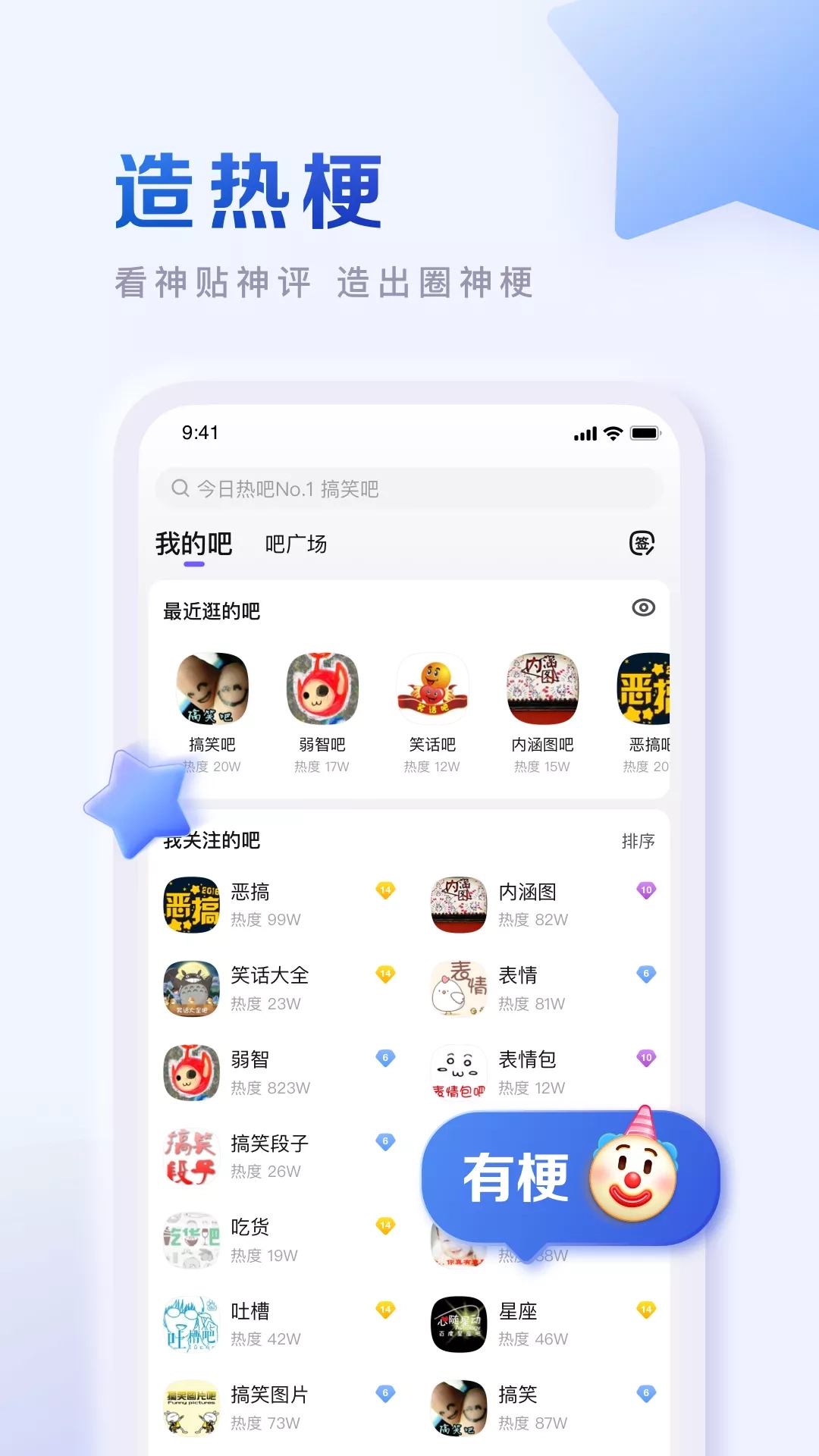 上贴吧!一起嗨翻天~~~ 【体育赛事】获取体育赛事的海量内容,男篮世预赛、NBA、欧冠、乒乓世预赛、中超、德甲、高尔夫等等,为自己喜欢支持体育竞技项目加油助威,和有趣的吧友过论精彩比赛,分享胜利的喜悦吧!~ 【游戏攻略】覆盖各个游戏领域,无论你是喜欢MOBA对战游戏:英雄联盟、魔兽世界;还是钟情FPS射击游戏:CS:GO、绝地求生;在游戏吧你都能找到和你爱好相同的吧友。在这里,不管是新游热游还是小众精品,你随时可以找到攻略学习大神操作、交朋友相约游戏开黑、和众多玩家一起讨论游戏心得,与大家分享交流游戏趣闻。 【潮流玩梗】想问「这个梗是什么意思」?想找流行热梗?来贴吧,弱智吧、滑稽吧、段子吧,和吧友一起创造下一个神梗! 下载贴吧,进入兴趣领域,遇见与你志同道合的吧友! 欢迎访问“贴吧意见反馈吧”提出您的宝贵意见或建议。
