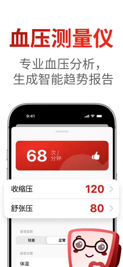 随时随地测量心率和记录血压,心脏、心理、性格,一测全知晓。 只需将你的手指放在摄像头上,就可以随时测量你的心率,还可以记录你的血压。它使你更容易跟踪你的日常健康。 - 用你的手指和摄像头检测心率 - 随时随地记录和分析血压 - 健康自测:心脏、心理、人格,一测全知晓 - 血氧饱和度分析和告警 - 按不同周期对血压和心率进行趋势分析 - 与Apple Health同步,同时你甚至可以从其他应用中轻松追踪心率和血压记录 重要说明: - 该应用程序不是为医疗目的而设计的。它只用于健身和作为一般健康信息的来源。 - 本应用通过手机摄像头和手机直接实时检测心率,并绘制模拟心电图(ECG)。同时,它支持通过HealthKit将心率同步到 "健康 "App上。 By using the app, you are agreeing to our EULA and Privacy Policy: https://www.apple.com/legal/internet-services/itunes/dev/stdeula/ https://wfrobin.wordpress.com/2023/05/17/privacy-policy/