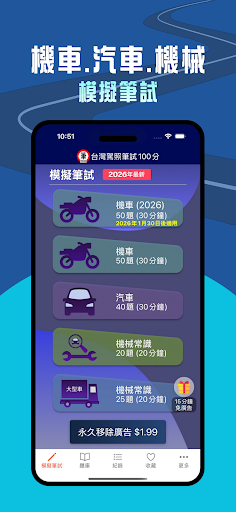 重点说明:驾照考试题库 机车2026,驾照考试题库 汽车2026<br>收录2026年最新版台湾『机车、汽车』驾照笔试题库<br>2026年新制机车题库全面取消是非题<br>2026年机车驾照笔试题库 总共1051题与公路总局同步更新<br>(机车危险感知影片题于2025年1月1日起再新增126题)<br>(机车笔试情境题于2018年11月1日起再新增60题情境题考题题库共120题)<br>汽车驾照笔试题库 总共1905题与公路总局同步更新<br>(汽车题库为2025年1月最新版本)<br><br>《功能》<br>■超逼真的模拟测验<br>■答案解析<br>■题目可加到我的最爱<br>■收纳模拟测验纪录<br>■收纳历史错误题<br>■可调整题目字体大小<br>■学习闹钟<br>■题目勘误回报系统:长按题目可直接回报<br><br>《机车题库类别》<br>■必考陷阱题<br>■机车危险感知影片题<br>■机车法规是非题(2026版本已经取消)<br>■机车法规选择题<br>■机车号志是非题(2026版本已经取消)<br>■机车号志选择题<br>■机车情境式题目<br><br>《汽车题库类别》<br>■必考陷阱题<br>■汽车法规是非题<br>■汽车法规选择题<br>■汽车号志是非题<br>■汽车号志选择题<br><br>请搜寻『驾照考试题库 机车2026』或是 『驾照考试题库 汽车2026』<br><br>●《2019酒驾新法简介》<br>新规定重点为汽机车分流,并提高酒驾违规罚锾。机车初次酒驾罚1万5000元到9万元未变,但汽车从原本1万5000元到9万,提高3万到12万。 5年内第二次酒驾累犯就处以最高罚锾,机车9万、汽车12万,第三次以上按次加罚9万;酒驾拒测、拒检也加重处罚,从9万提高到18万,5年内第二次后每次加重18万元。<br><br>除了罚锾之外,机车初犯吊扣驾照1年、汽车吊扣2年,附载未满12岁儿童或者肇事致人受伤,吊扣驾照2到4年。针对酒驾肇事致人重伤或死亡案,将可没入车辆。<br><br>另外,也增设酒驾同车共责对乘客的处罚规定,对于年满18岁的同车乘客,可罚600元至3000元罚锾,但排除年纪太长、心智障碍、或搭乘计程车、公车等运输业乘客的处罚。<br><br>《脸书粉丝团》<br>■ 与大家一起研究考题 <br>https://www.facebook.com/DriverLicenseTW/<br><br>《题库来源》<br>■ 交通部公路总局: http://www.thb.gov.tw/