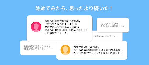 ◆超过1000万用户选择的排名第一的学习管理应用◆<br><br>◆超过一半的高考考生都在使用!◆<br><br>◆非常适合备考高中入学考试和日常考试!◆<br><br>◆也是考取资格证书和学习语言的理想选择。每年有9万人通过Studyplus实现学习目标!◆<br><br>Studyplus是你的“学习伙伴”,它通过记录和可视化你的学习过程,激励你并支持你持续学习。<br><br>与目标一致的学习伙伴互相鼓励,养成良好的学习习惯!<br><br>【推荐人群】<br><br>◆ 学生及考生<br><br>・缺乏学习动力……<br><br>・想要客观了解自己的学习时间和进度<br><br>・想要学习其他考生的学习方法和资料<br><br>・想要与目标相同的同伴一起学习,共同进步<br><br>◆ 在职人士备考或学习语言<br><br>・想要管理备考进度或语言学习进度<br><br>・想要利用空闲时间学习<br><br>・想要养成规律的学习习惯<br><br>【主要功能及使用方法】<br><br>① 记录并可视化学习时间<br><br>・使用秒表或计时器自动记录<br><br>・记录每份学习资料的学习量,可视化学习进度<br><br>② 管理学习进度<br><br>・查看每份资料的学习时间报告<br><br>・设置每周目标和考试倒计时,让学习更有条理<br><br>③ 与同伴交流<br><br>・关注其他学习伙伴,获取灵感<br><br>・点赞和评论,激励自己<br><br>④ 职业选择及大学入学考试准备<br><br>- 详细设置理想学校,细化到大学院系及专业。<br><br>- 使用教育社的“红皮书”趋势和策略以及“入学考试内幕贴士”备考。<br><br>- 在Studyplus上一站式查看所有大学的信息。<br><br>[用户评论(节选)]<br><br>- “我的学习动力增强了!我已经用了2-3年了。”(高二男生)<br><br>- “我的第一志愿!我考上了!ヽ(;▽;)ノ 我很高兴我坚持使用Stapla!”(高三女生)<br><br>- “我用它来备考。它帮助我了解我的学习时间,我很喜欢用它!”(初一女生)<br><br>- “我通过了行政文书考试!谢谢!”(大学三年级男生)<br><br>- “学习已经成为一种习惯,我可以学习更多了!” (职场人士/男性)<br><br>【多种使用场景!】<br><br>◆ 测试与考试<br><br>・大学入学考试、高中入学考试及常规考试备考<br><br>・课程准备与复习(英语/数学/日语/科学/社会研究)<br><br>◆ 语言学习<br><br>・英研、托业、托福、英语会话、跟读<br><br>・支持多种语言,包括中文、韩语和法语<br><br>◆ 资格考试<br><br>・行政文书、社会保险劳动顾问、注册会计师、IT认证、公务员考试等<br><br>◆ 其他<br><br>・编程、阅读、音乐练习、力量训练、慢跑等<br><br>【将你的努力从“记录”变成“习惯”!】<br><br>适合所有有目标的人。<br><br>只需15分钟的练习,就能成为改变未来的第一步。<br><br>今天就开始使用Studyplus,开启“持续学习”之旅。<br><br>【使用须知】<br><br>・本服务面向初中一年级及以上学生开放。<br><br>*部分服务可通过补习班或学校提供给初中以下学生。<br><br>・请在使用本服务前阅读并同意使用条款。<br><br>・Studyplus 使用条款<br><br>https://www.studyplus.jp/terms