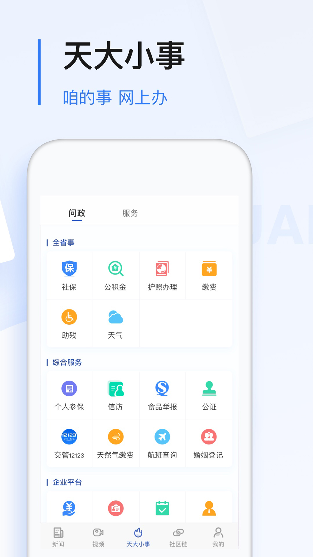 *新闻 <br>随时随地为您提供有速度、有热度、有温度、有态度的新闻。 <br>*评论 <br>热点焦点及时评,为您观察纷繁复杂的世界提供不一样的视角。 <br>*服务 <br>政务服务、生活服务全新上线,支持城市定位,将所需服务送到您手边。 <br>*炫酷 <br>音频、视频、3D动画,炫酷时尚的表现形式,让新闻更加“好玩” <br>*政务 <br>移动政务发布厅全新改版,政务信息一站式获取。 <br>*问政 <br>独家网络问政平台,不论何时何地有啥需求,直接帮您送达领导案头。 <br>*公益 <br>公益频道增加调查、投票等功能,只需一“点”爱心,汇聚公益洪流。 <br>*视觉 <br>新颖别致的版块划分,让界面更加简洁、清新,独树一帜。
