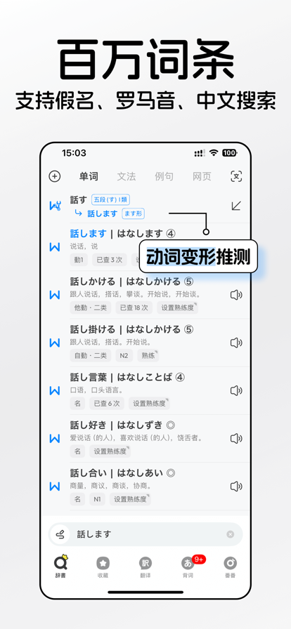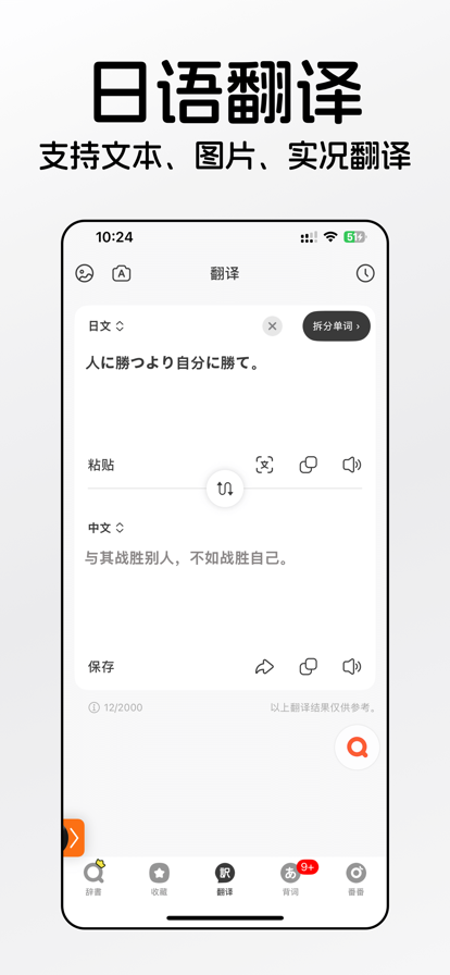 『一起学日语,渡辞海』- MOJi辞書(じしょ)是百万用户共建的日语学习词典,支持自动识别假名、汉字、罗马音输入,共收录百万详解词条。 【查词】 精准搜索:快速精准查词,确保第一个结果就是想要的 海量词库:实时更新,自创单词打造专属词库,内置离线词库无网可用 详解词条:动词活用一览,分类解析,涵盖近反义词,支持写笔记 【输入】 手写输入:简单画几笔,就可精准识别汉字假名 图片识别:提取图片中的日文并提供查词、翻译等 五十音建议:初学者输入日语更方便 【更多】 翻译:中日互译,解析句子结构,对日文注音,提取重点词汇 问答:用户共建,补充查词无法覆盖的难点 词单:单词列表由官方/全球用户创作,可收藏背词 背词:支持十多种题型,艾宾浩斯遗忘曲线复习,自由配置 辅助阅读:长文本/网页标注发音,动词原型,一键查词 小组件:桌面随机,遇见新词 收藏:打造你的专属辞书,全平台同步,数据多地备份 听单词:单词列表洗脑循环,跟读党耳机党福音 推送:定制单词推送,可选词单(如:JLPT N1词单) 【政策协议】 使用协议:https://www.krosea.com/mojidict/terms-of-use 会员服务协议(自动订阅服务协议等):https://www.krosea.com/mojidict/payment-agreement 【联系方式】 App:打开“我的”>“联系我们” 邮箱:mojisho.support@mail.shareintelli.com 微信公众号:MOJi辞書 Twitter:MOJI_SERIES